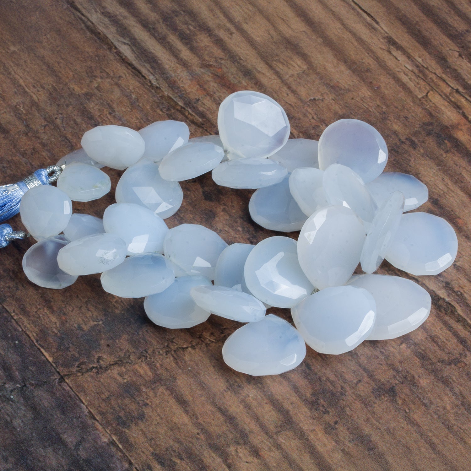 These natural Turkish Chalcedony faceted heart beads feature soft, milky blue tones with gentle translucency and a luminous, silky glow. The faceted finish adds subtle sparkle across the smooth heart shapes, enhancing the stone’s natural light play without overpowering its calm, airy character. Measuring approximately 13x21mm, the hearts offer a substantial, sculptural presence with a refined, elegant profile.