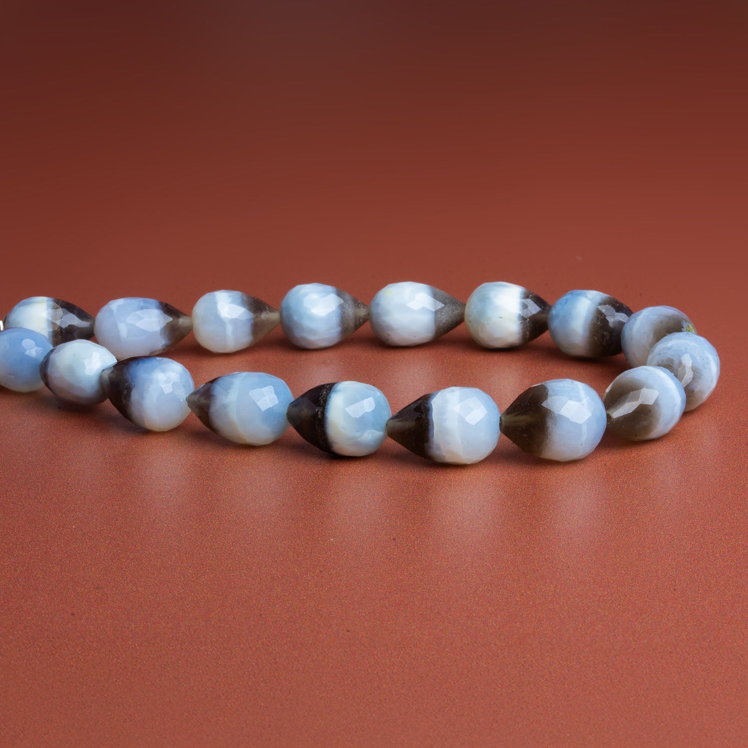 These striking Banded Denim Opal teardrops—also known as Owyhee Opal—feature soft, clouded blues layered with creamy whites and subtle earth-toned banding, all brought to life with a crisp faceted finish. Mined in the Owyhee region of the Pacific Northwest, this material is prized for its denim-like color palette and natural striations that give each stone a calm, atmospheric presence. The faceting adds gentle sparkle without overpowering the stone’s naturally muted elegance, making each bead feel refined yet organic.