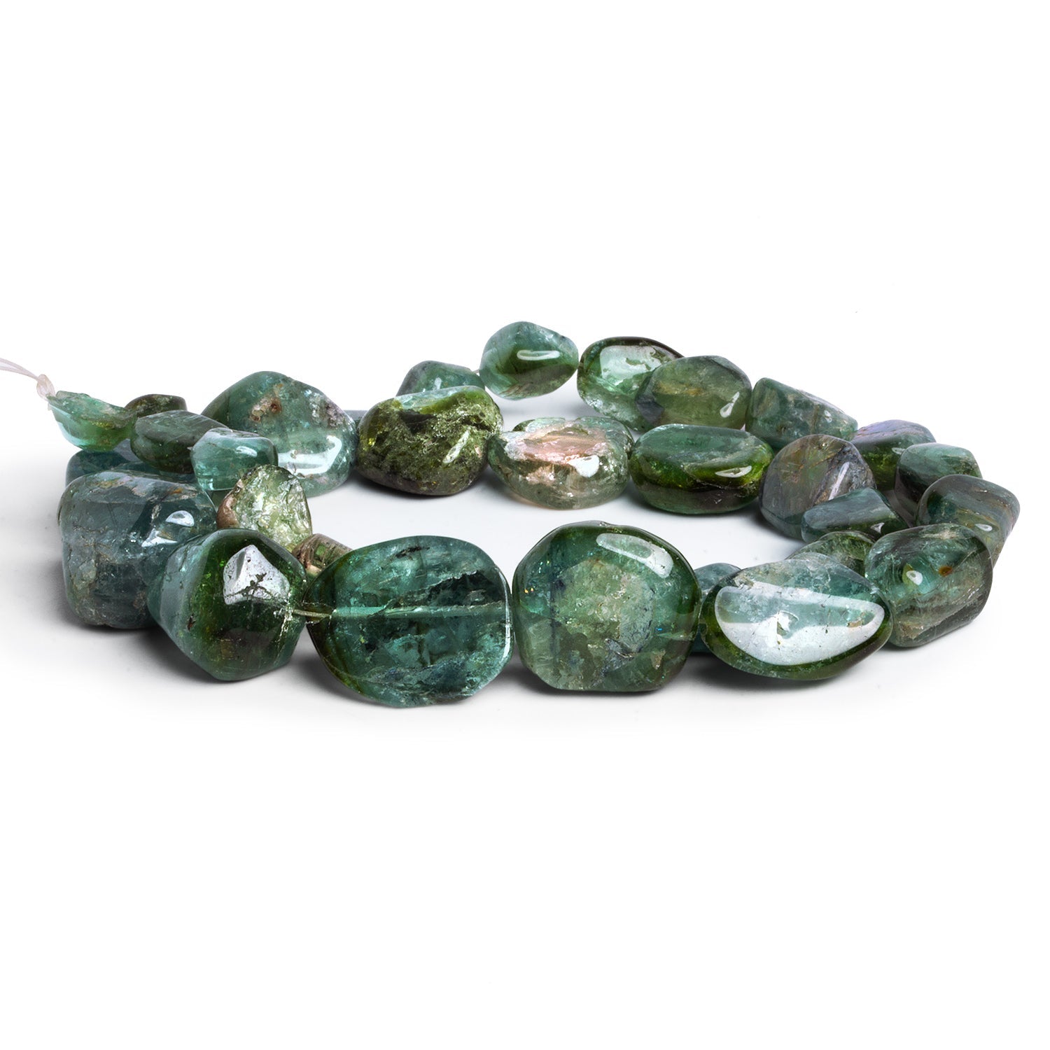 Green & Indicolite Tourmaline Plain Nuggets range from approximately 9x8mm up to 19x15mm, offering a beautifully organic mix of scale and form along each strand. These freeform nuggets highlight tourmaline’s natural color spectrum, blending deep mossy greens with cool blue-green indicolite tones, often with subtle zoning and internal texture visible beneath the polished surface.