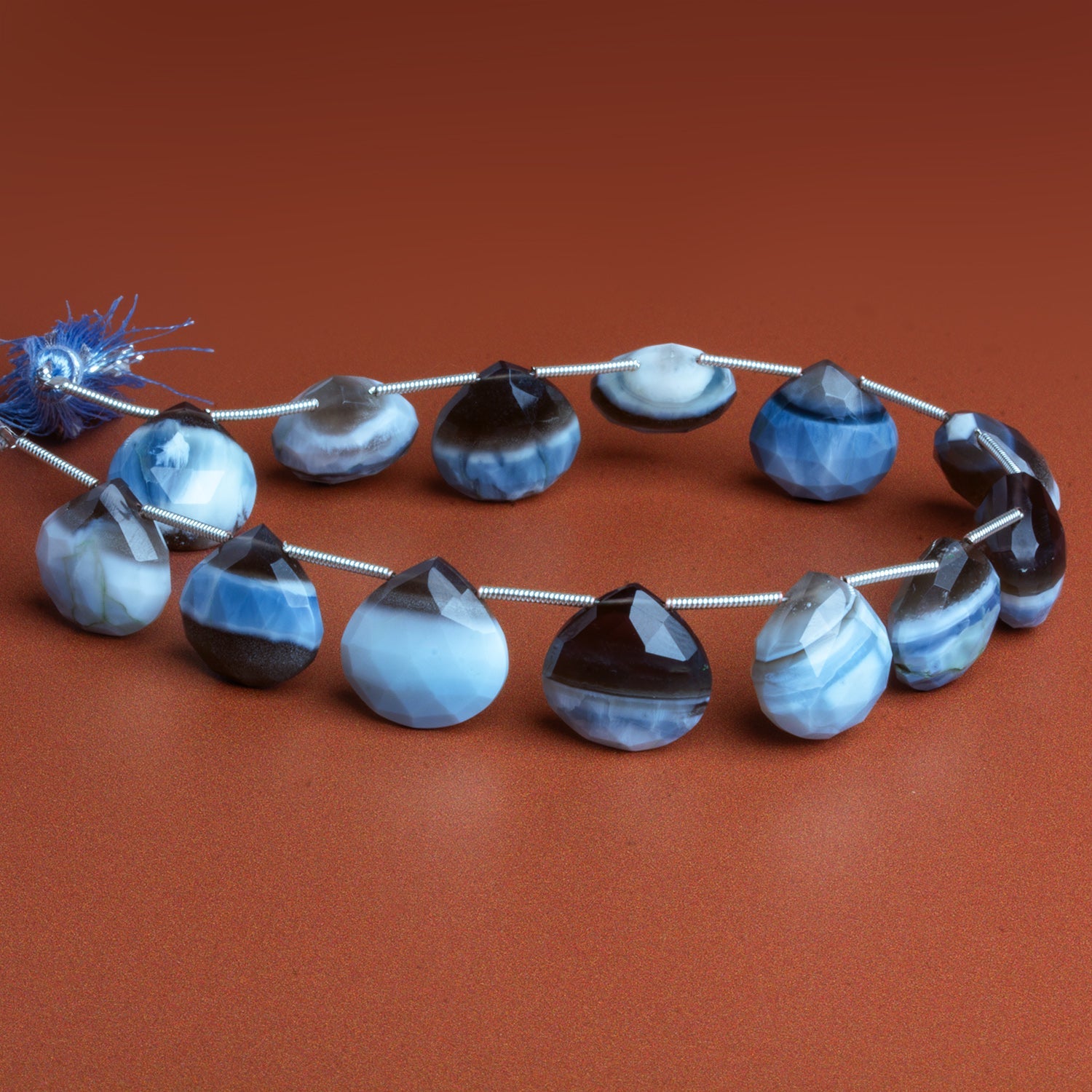 15mm Denim Opal Faceted Hearts showcase the unmistakable cool-toned beauty of this American classic, also known as Owyhee Opal. Mined in the Owyhee region of eastern Oregon, this material is prized for its layered bands of misty blue, slate gray, soft white, and inky charcoal—often resembling stormy skies or worn denim fabric. The faceted heart shape adds extra dimension, catching light across the natural banding while preserving the stone’s earthy, grounded character.