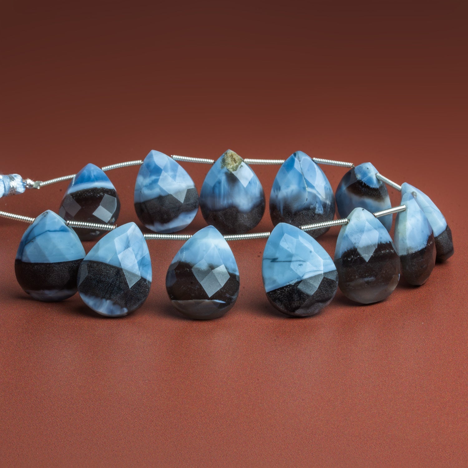 20x15mm Denim Opal Faceted Pear Beads offer a bold, sculptural take on one of the most visually striking opal varieties available. These large-format pear shapes showcase dramatic banding in layered shades of dusty sky blue, slate, cream, and deep charcoal, with patterns that range from softly clouded gradients to crisp, high-contrast divisions. The faceted finish adds depth and movement across the surface, catching light without overpowering the stone’s naturally matte, denim-like character. Each bead is individually unique, with organic color zoning and subtle inclusions that emphasize the natural origin of the material.