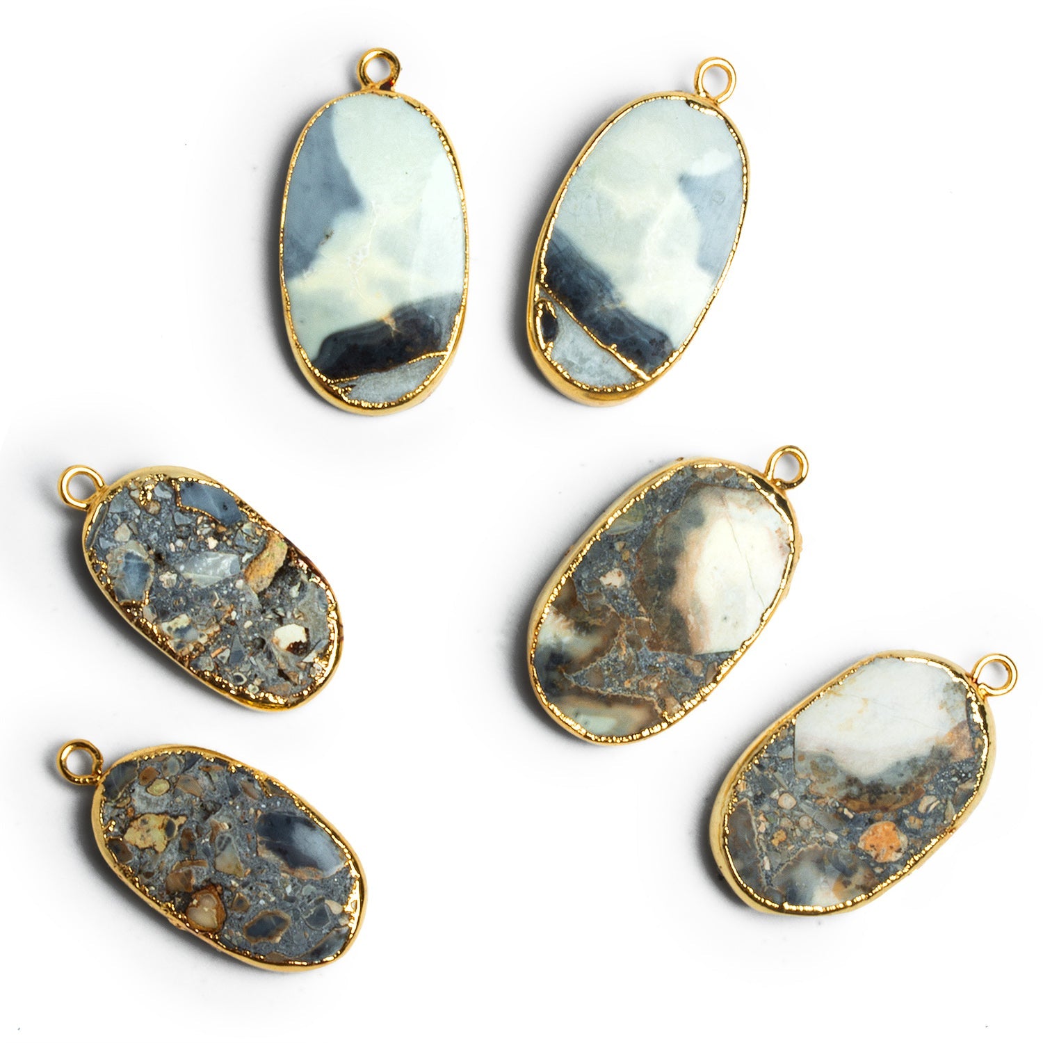 These gold leafed jasper oval pendants showcase beautifully varied natural patterning, with soft creams, stormy blues, and earthy tan tones flowing through each stone. The organic movement in the jasper gives every pendant a landscape-like quality, ranging from brecciated textures to smooth clouded transitions, all brought into focus with a faceted surface that catches the light without overpowering the stone’s natural character. Finished with a bright gold leafed edge and integrated loop, these pieces are ready to use as striking focal drops or statement connectors.