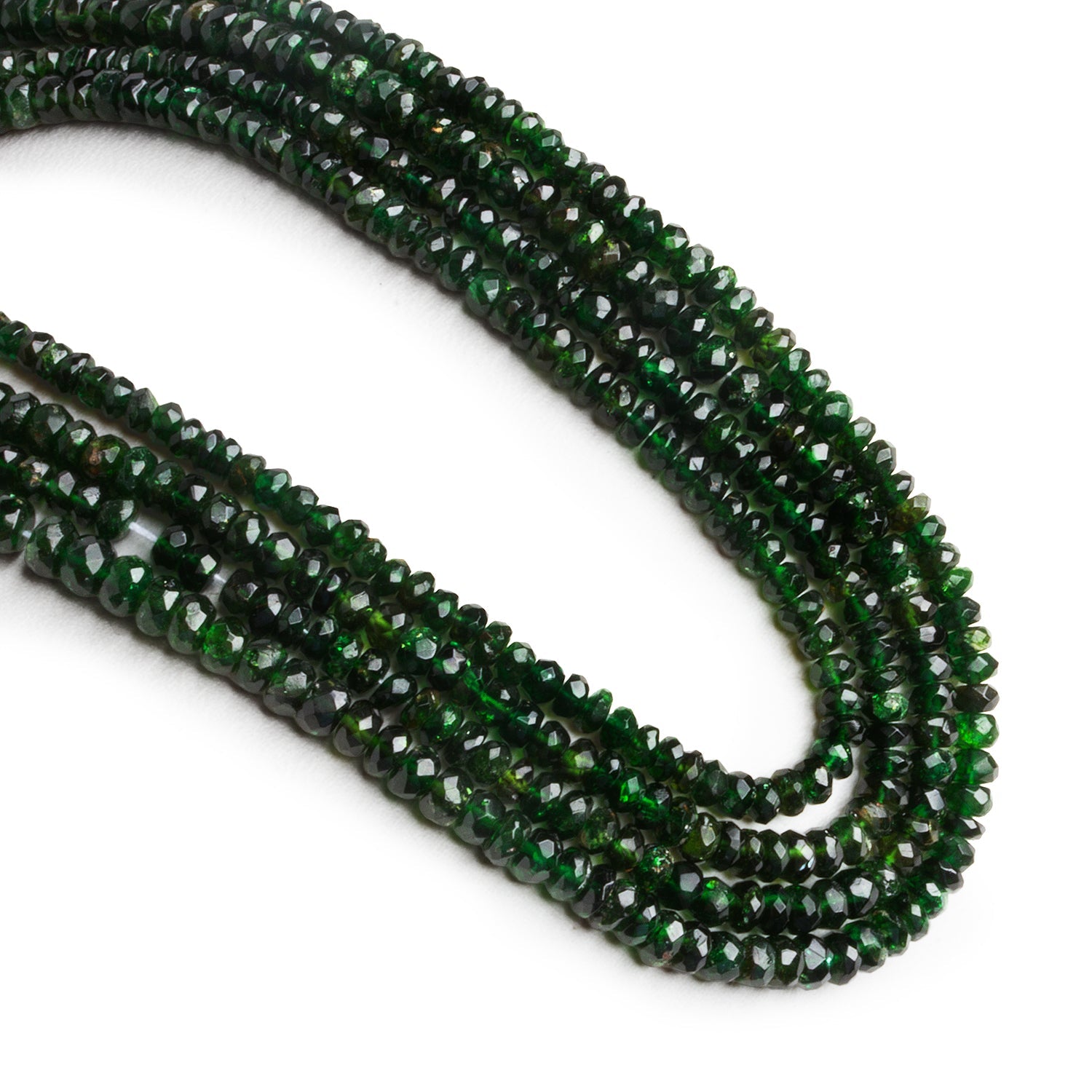 Rich, vivid, and endlessly captivating, these Chrome Tourmaline faceted rondelles glow with deep forest-green brilliance and lively flashes of light. Each tiny bead is precision-cut to reveal sparkling facets that dance across the strand, showcasing the saturated green tones that make chrome tourmaline so sought-after. Subtle natural variation gives every strand depth and character, creating a lush palette that ranges from mossy emerald hues to dark evergreen highlights.