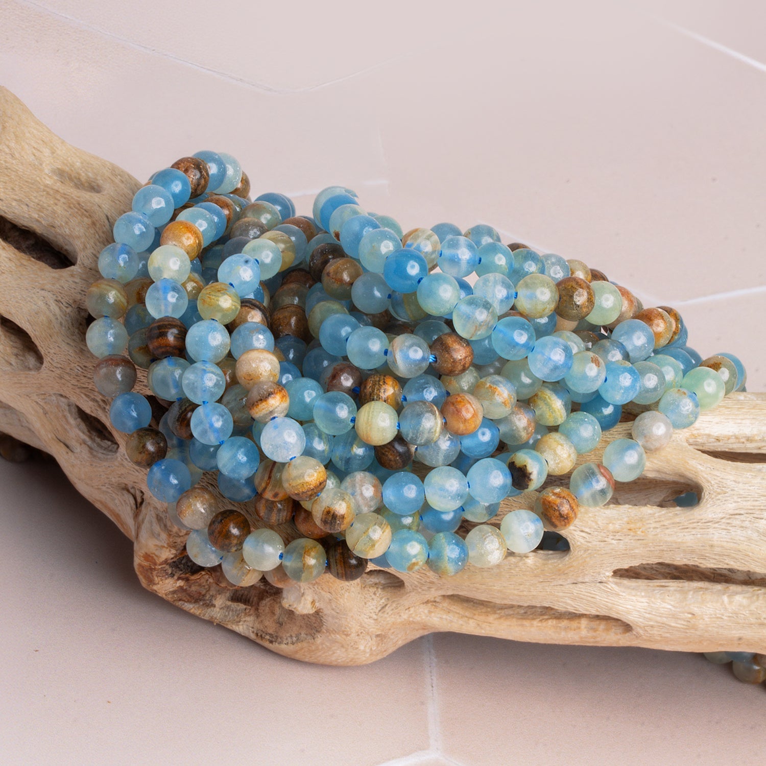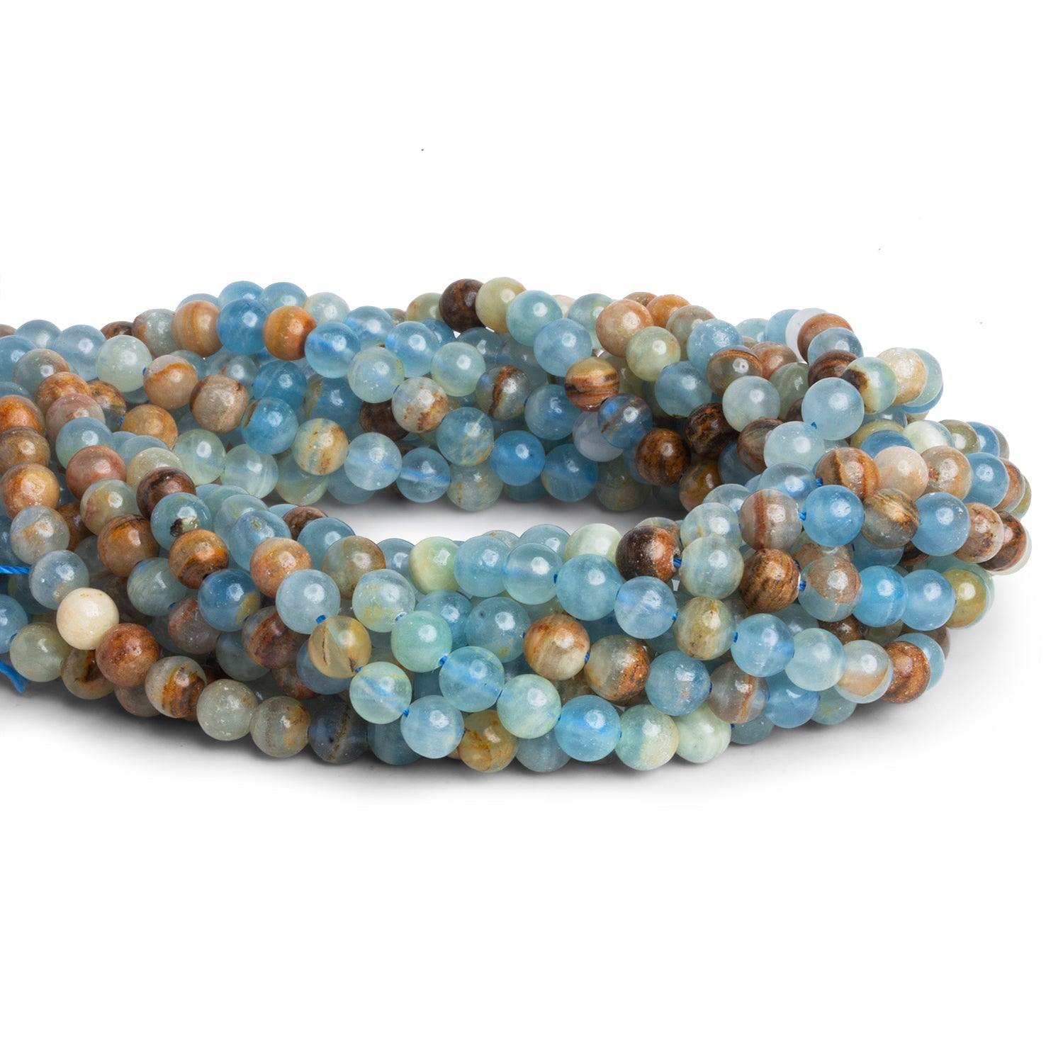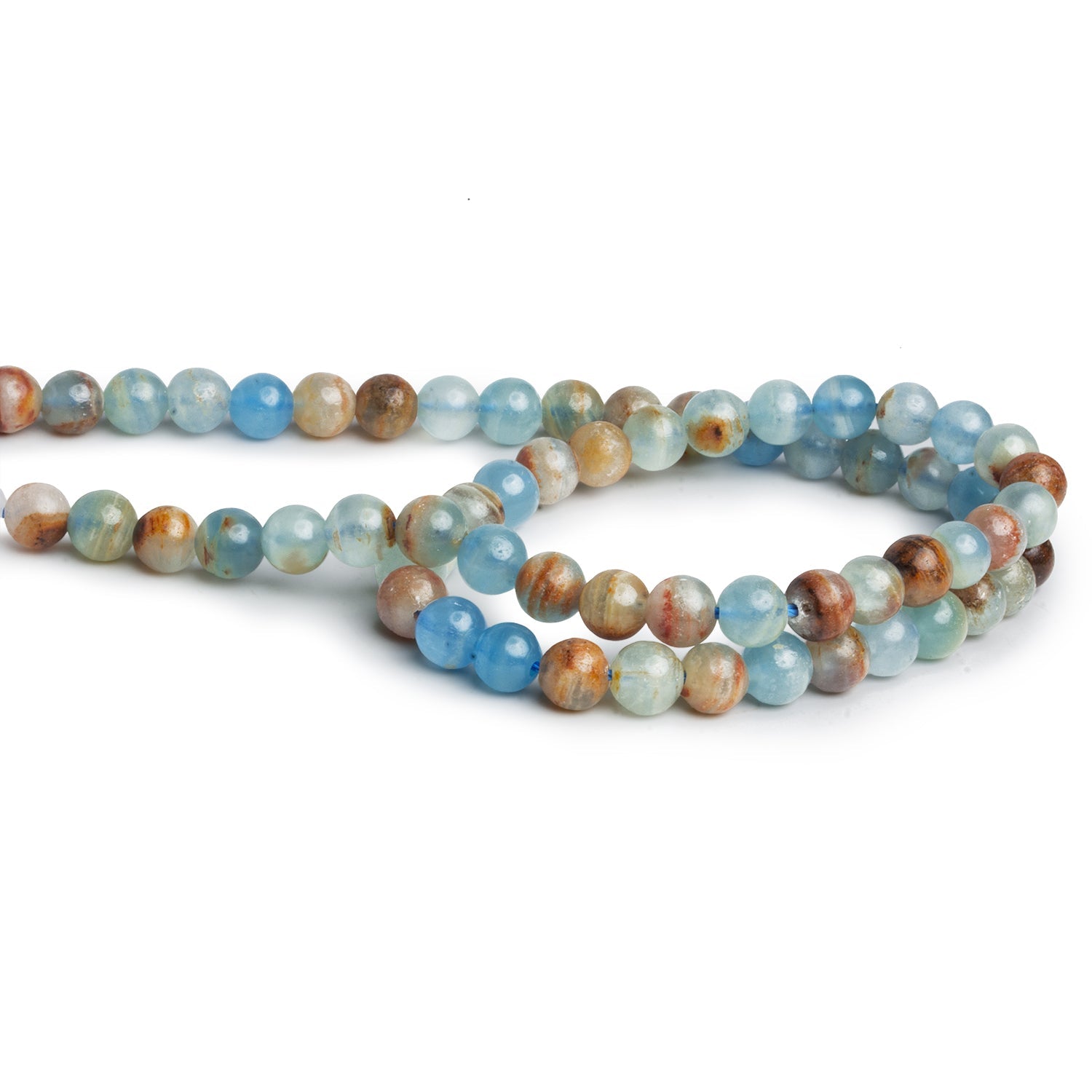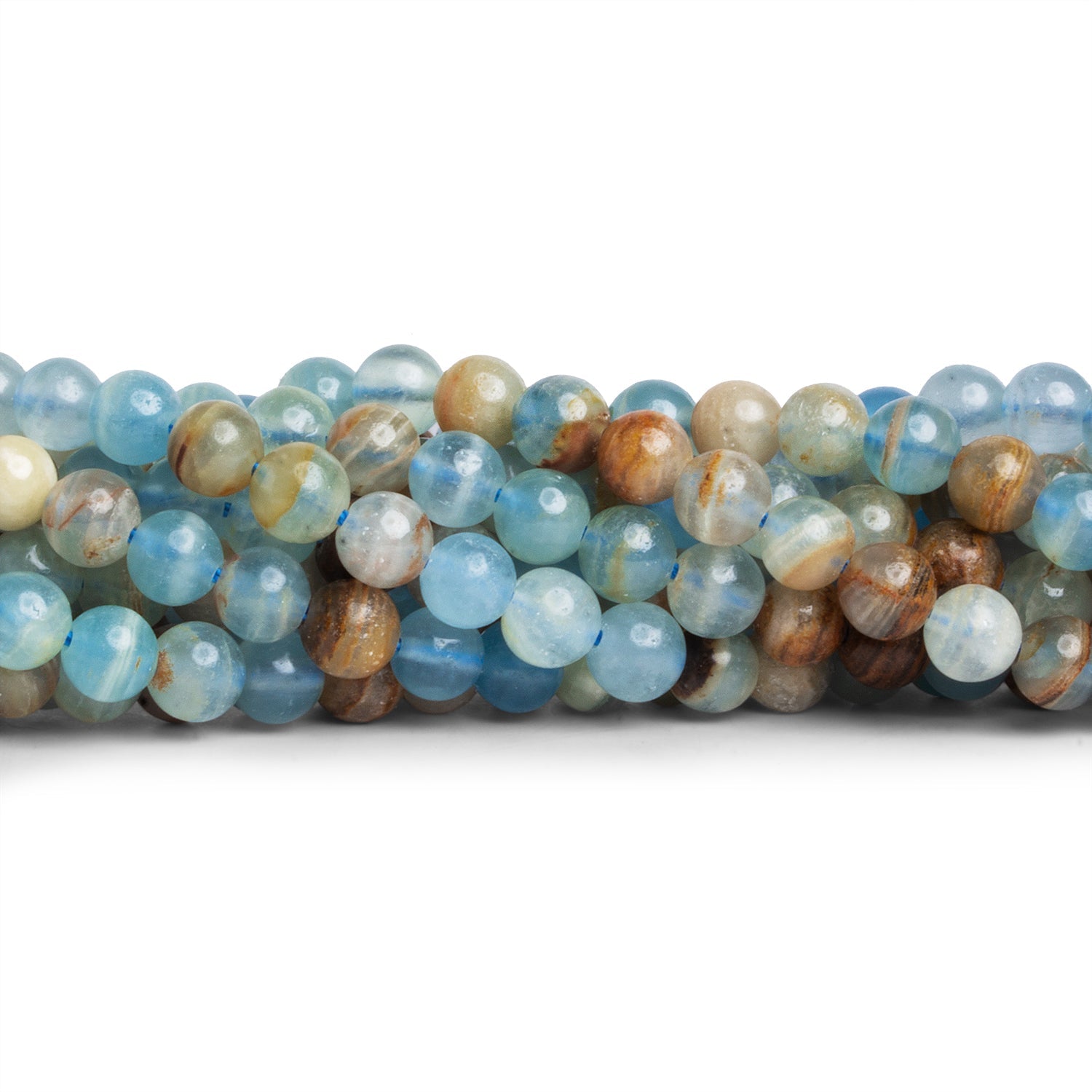 Smoothly polished into classic rounds, each bead displays its own unique combination of translucent blues and earthy veining, giving designs depth and natural movement. Elegant yet grounded, these rounds are perfect for serene statement pieces or refined everyday jewelry with an organic, coastal feel.