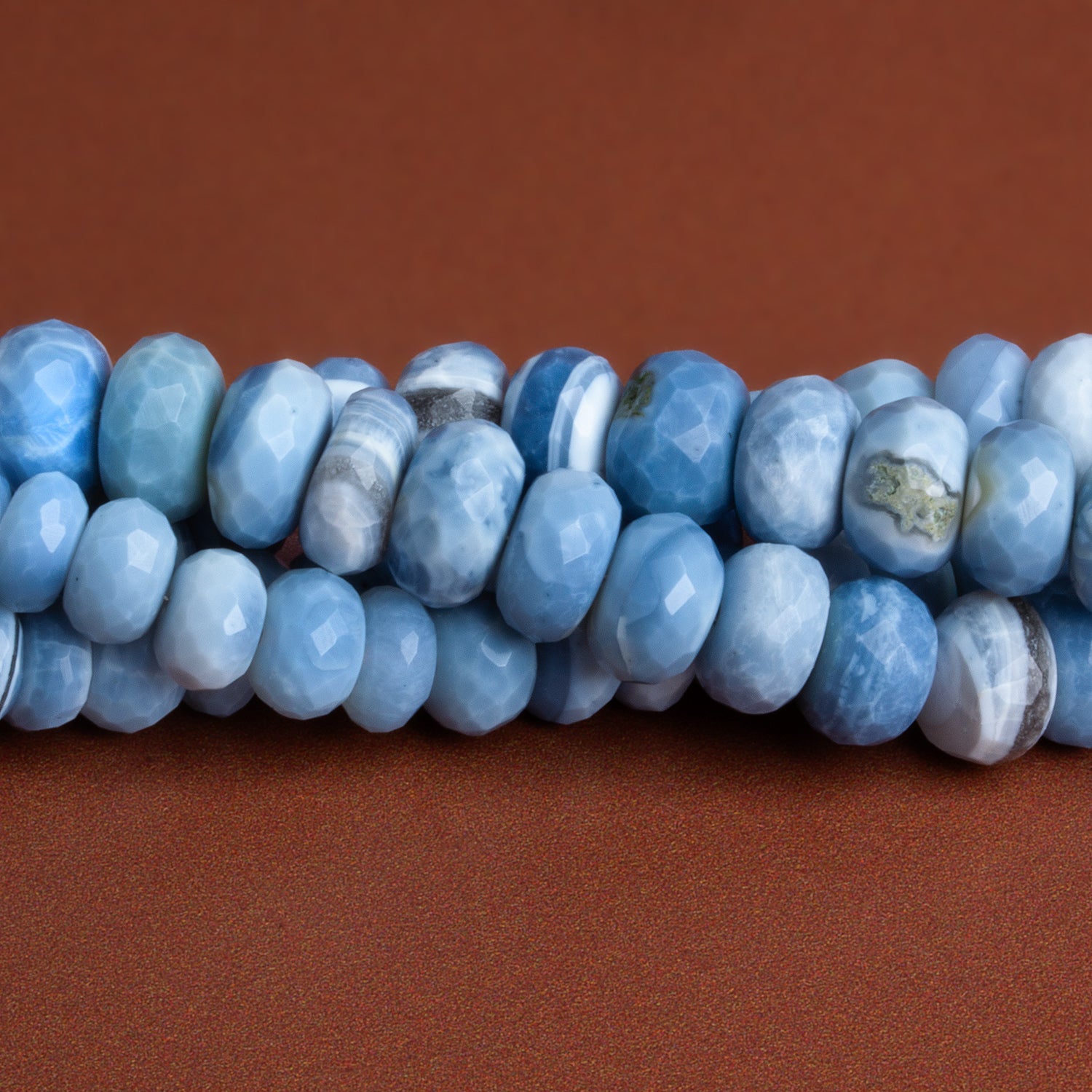 These 7–11mm Denim Opal Faceted Rondelles showcase the unmistakable palette that has made this material a favorite among designers—soft powder blues, clouded whites, and inky brown banding layered in naturally occurring horizontal patterns. Also known as Owyhee Opal, this gemstone is mined in the Owyhee region of the Pacific Northwest and prized for its denim-like striations and organic color transitions. The faceted rondelle cut adds a subtle shimmer across the surface while preserving the stone’s natural depth, making each bead feel both refined and earthy.
