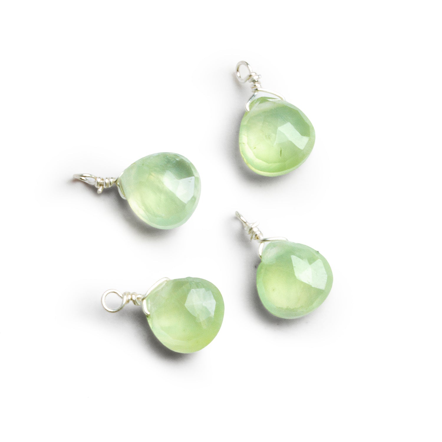 Soft, luminous green and quietly translucent, this matched set of four 7mm Prehnite heart pendants has a gentle, glassy glow that feels calm and botanical. Each heart is precision faceted on the front to catch light beautifully, while the backs are flat for clean, comfortable wear and stable design placement. Hand-wrapped in fine silver wire with a sturdy top loop, these pendants are ready to slide onto chains, hoop earrings, or charm bracelets right out of the pack.