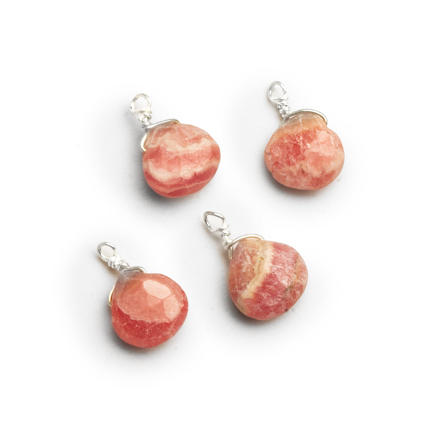 7mm Rhodocrosite Wire-Wrapped Heart Pendants — Matched Set of 4. Softly faceted into petite heart silhouettes, these 7mm rhodocrosite charms glow with romantic layers of blush, rose, and peachy coral, often streaked with dreamy cream veining that feels painterly and organic. Each stone is gently cradled in a minimalist sterling-tone wire wrap with a small top loop, making this coordinated set of four matching pendants perfect for earrings, charm bracelets, or sharing across a design collection.