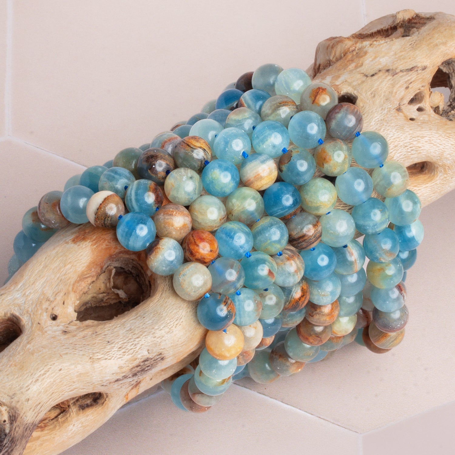 Smoothly polished into classic rounds, each bead displays its own unique combination of translucent blues and earthy veining, giving designs depth and natural movement. Elegant yet grounded, these rounds are perfect for serene statement pieces or refined everyday jewelry with an organic, coastal feel.