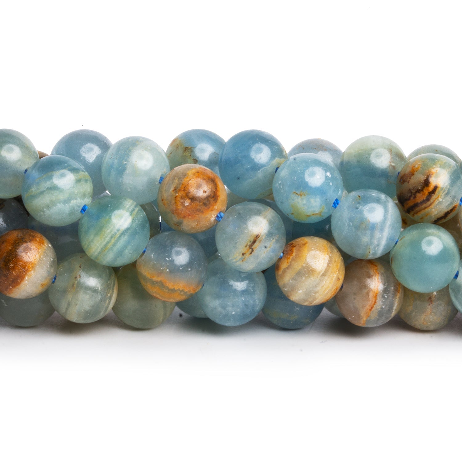 These 8mm Argentina Lemurian Aquantine Calcite rounds glow with tranquil shades of seafoam, icy blue, and soft aqua, accented by natural bands of warm caramel and sandy gold. Often referred to in the trade as “Blue Onyx,” this material is actually a beautifully banded calcite, prized for its soothing oceanic palette and distinctive layered mineral patterning.