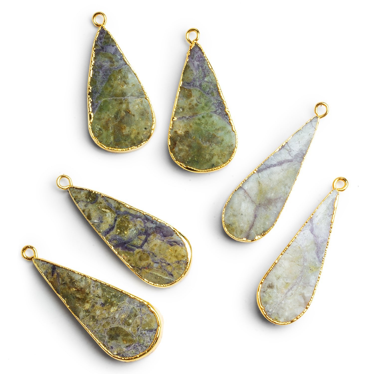 These pear-shaped Purple Stripe Jasper pendants feature an earthy blend of olive and moss green tones layered with soft cream and flowing lavender-to-purple veining that gives each stone its signature striped character. The natural patterns feel organic and painterly, with subtle color transitions that move from muted green into gentle violet streaks, making each piece visually rich without being loud. Finished with a bright gold leafed edge, the warm metallic border adds contrast and polish while still letting the natural stone remain the star.