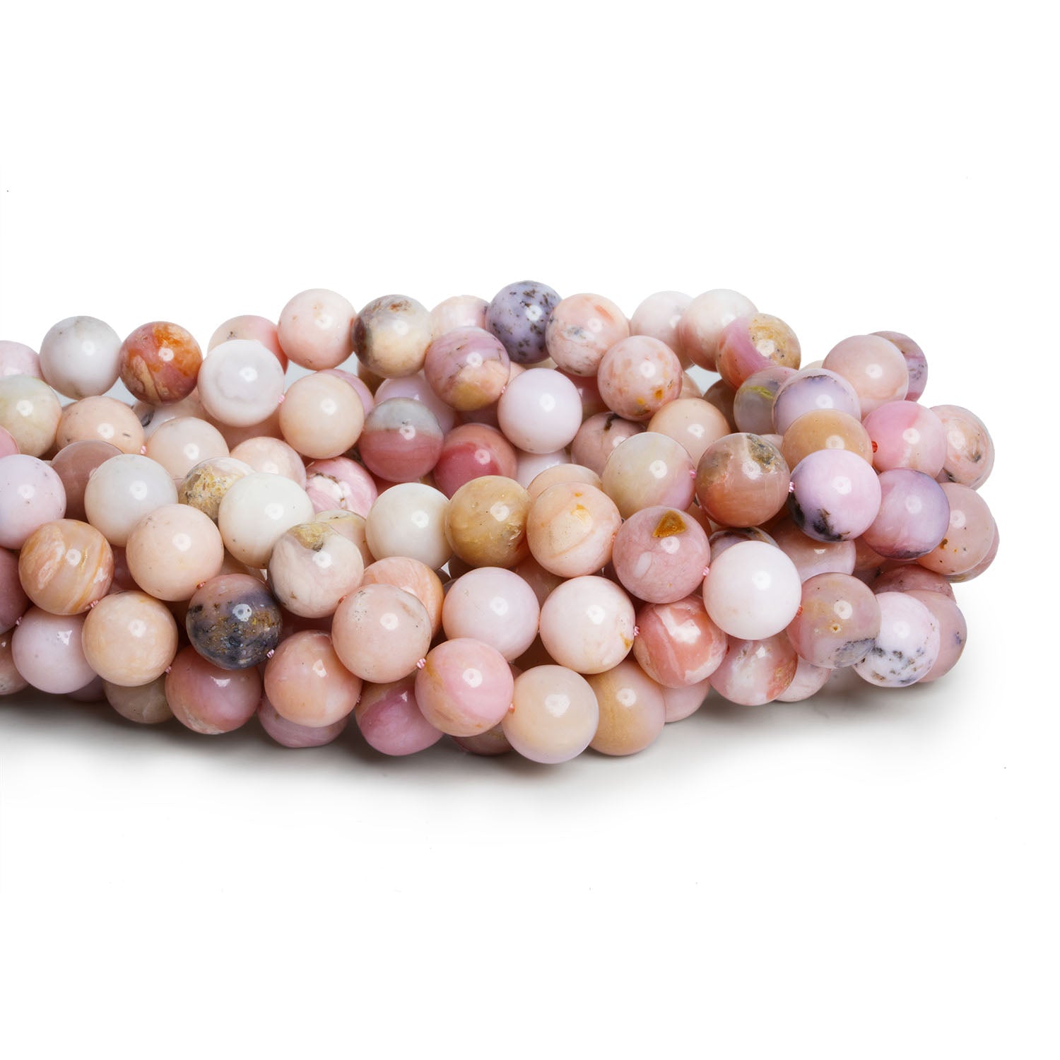 The beads are approximately 9mm in diameter, featuring a diverse range of Pink Peruvian Opal colors including creamy tones, rich pinks, and earthy accents. These masterfully crafted plain round beads showcase the exquisite quality and vibrant colors that fans of Pink Peruvian Opal will surely appreciate. Additionally, these beads have a large 1mm drill hole for easy stringing.