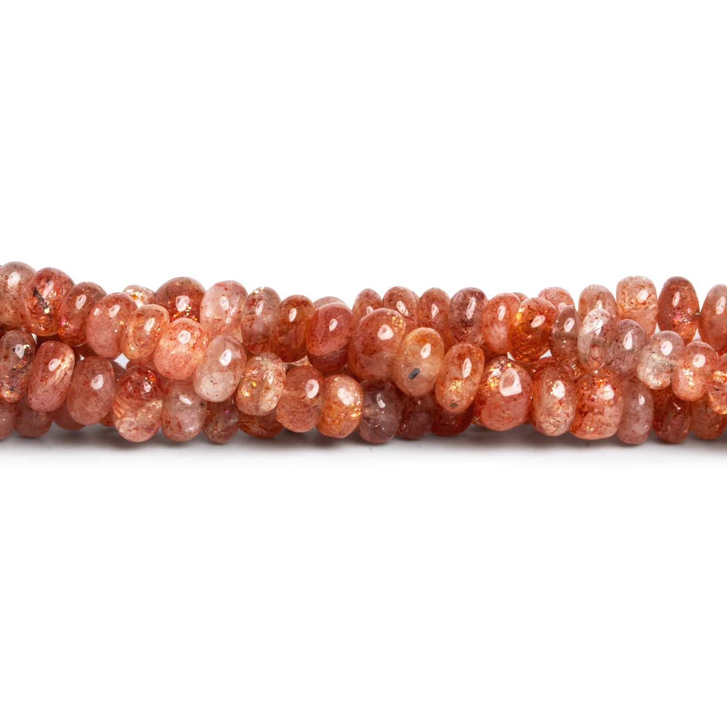 These 4–6mm Sunstone plain rondelles glow with warm peach-to-burnt-orange tones, animated by the stone’s natural aventurescence—tiny coppery inclusions that flash softly as the beads move. Smoothly polished and slightly graduated, each rondelle carries its own balance of translucency, color zoning, and sparkle, creating a strand with depth and organic variation rather than uniform repetition.