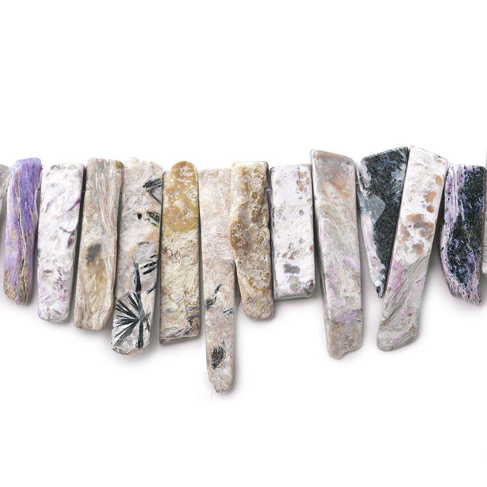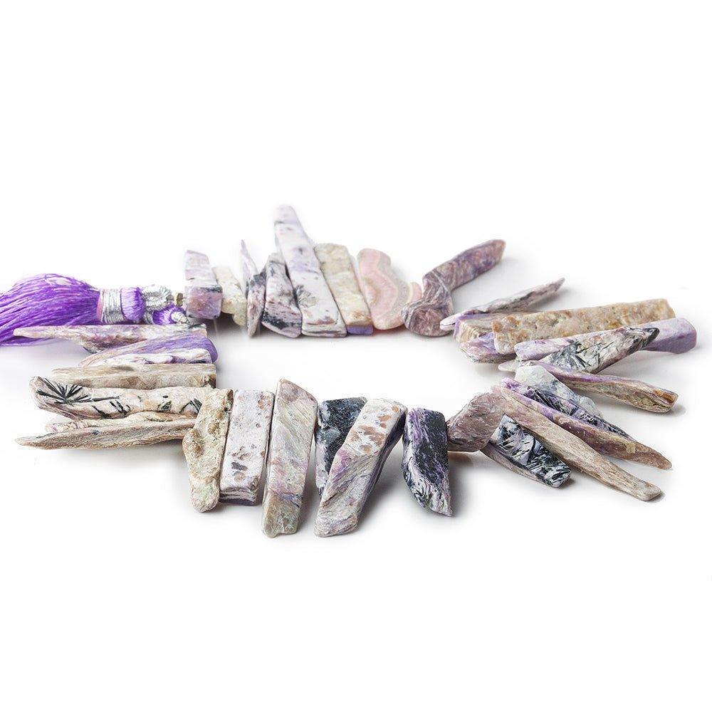 Beads measure about 11x5mm to 21x7mm. These exquisite, elongated chip beads are top-drilled to facilitate their use as striking focal beads. The signature swirling textures and pop of purple color that makes this gemstone so favored are on full display in elegant form. Plan your next round of jewelry designs around these Charoite Elongated Chips, perfect for statement necklaces, eye-catching earrings and much more.