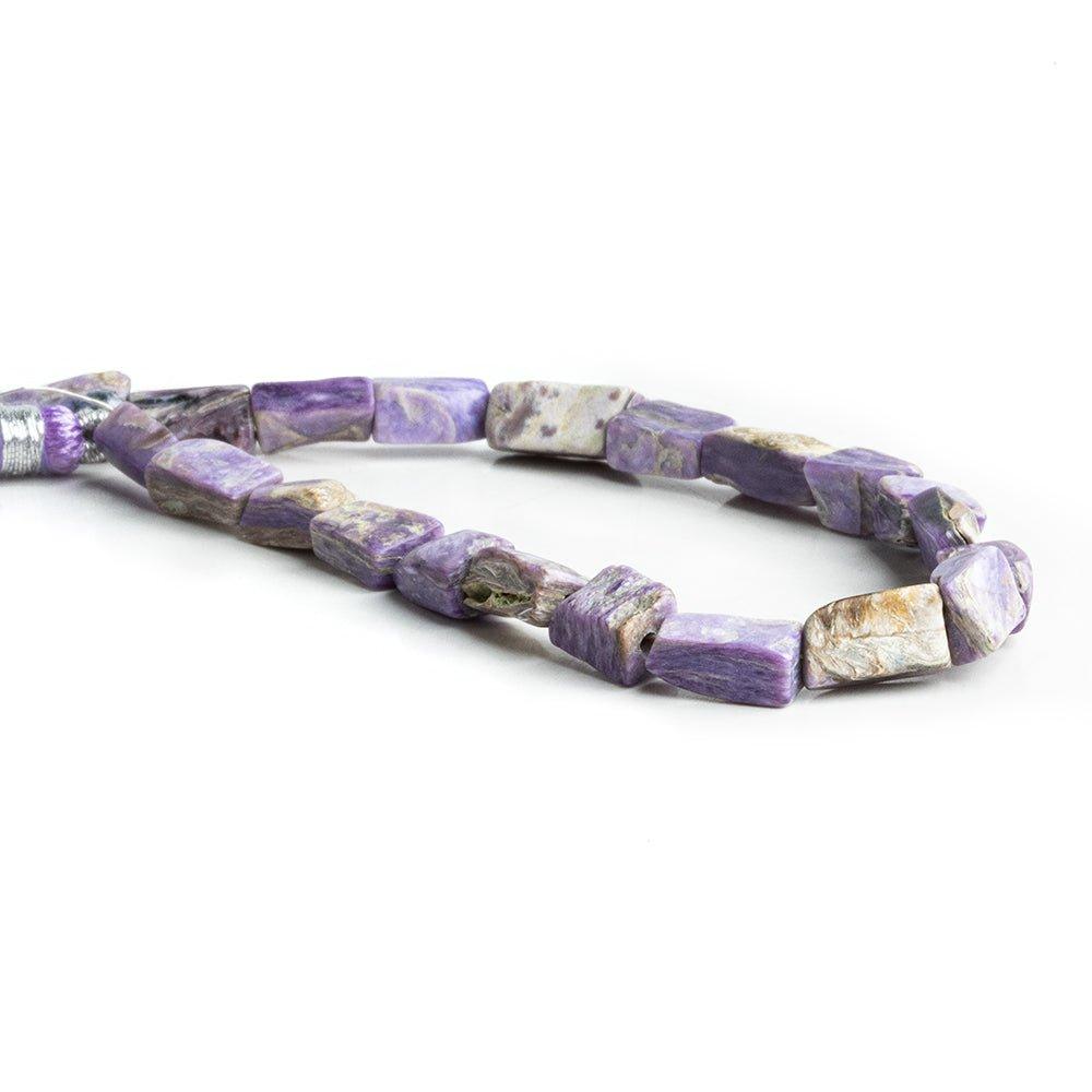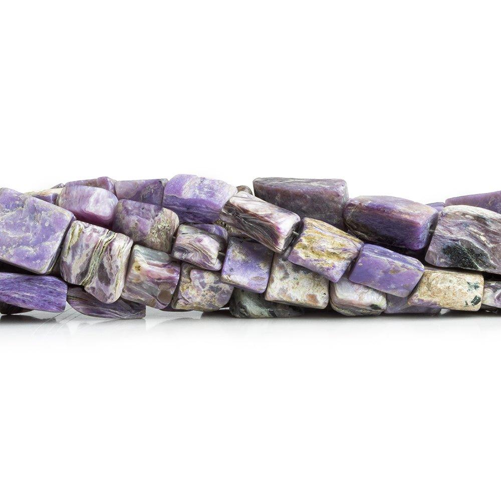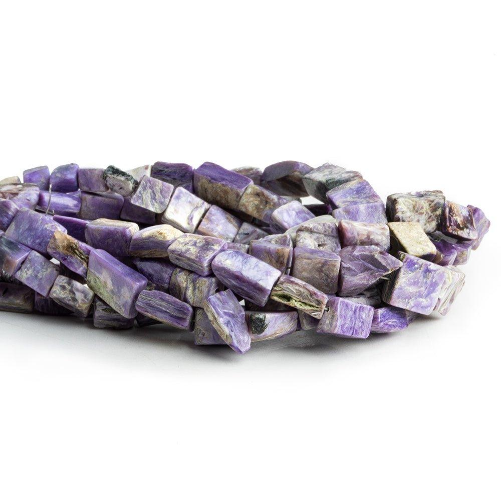 Beads range widely in size from about 5x4mm to 14x9mm. Our beautiful and specially curated nugget pieces show off a generally rectangular shape brimming with the colors and swirling textures that make Charoite a favorite amongst jewelry designers. These elongated shapes are ideal for use in Jewelry Designs ranging from necklaces to earrings and even bracelets.