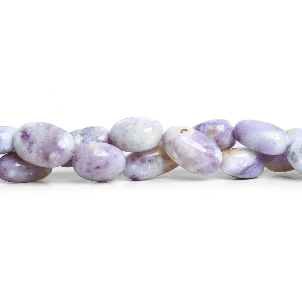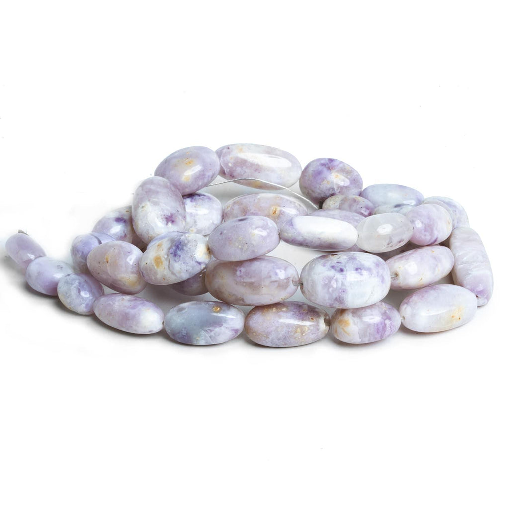 Beads range from about 9x8mm to 19x10mm. This curated strand features a beautiful, elongated oval or pill shape on light milky to opaque bodies. Expect purples to grace an off-white background that verges on light pink in areas. Fans of Morado Opal will want to jump on these unique pieces full of swirling patterns and speckled textures.