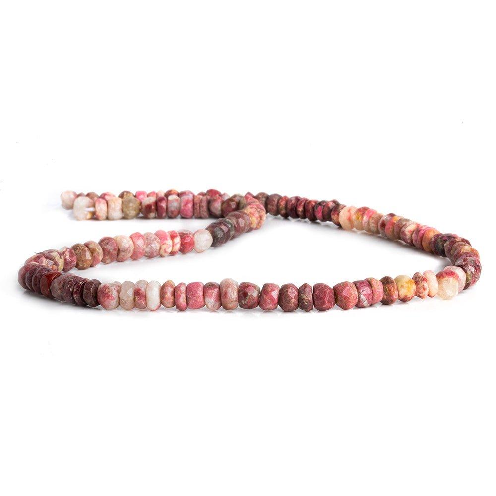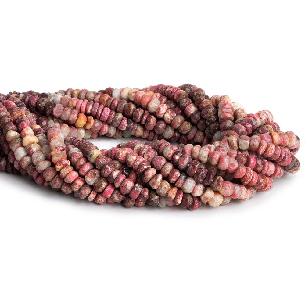 Beads average 4.5mm to 5mm in diameter. Hand Cut Rondelles are crafted by artisans who take advantage of the natural beauty of the stone to shape each bead to its ideal dimensions. Expect more variation in size & shape with beads worked in this style. Each strand of these Thulite beads exhibit a marvelous array of pink & magenta hues.