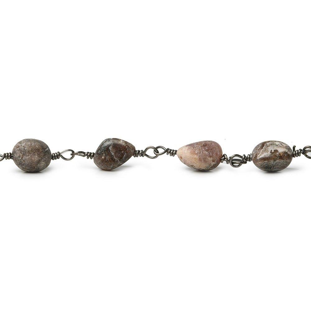 7x5-9x6mm Matte Chocolate Rhodocrosite plain nugget Black Gold plated Chain sold by the foot increments for this well crafted, hand wrapped looped link with our custom gemstones to Silver plated, Black Gold plated, or Gold plated wire for a finished jewelry look.