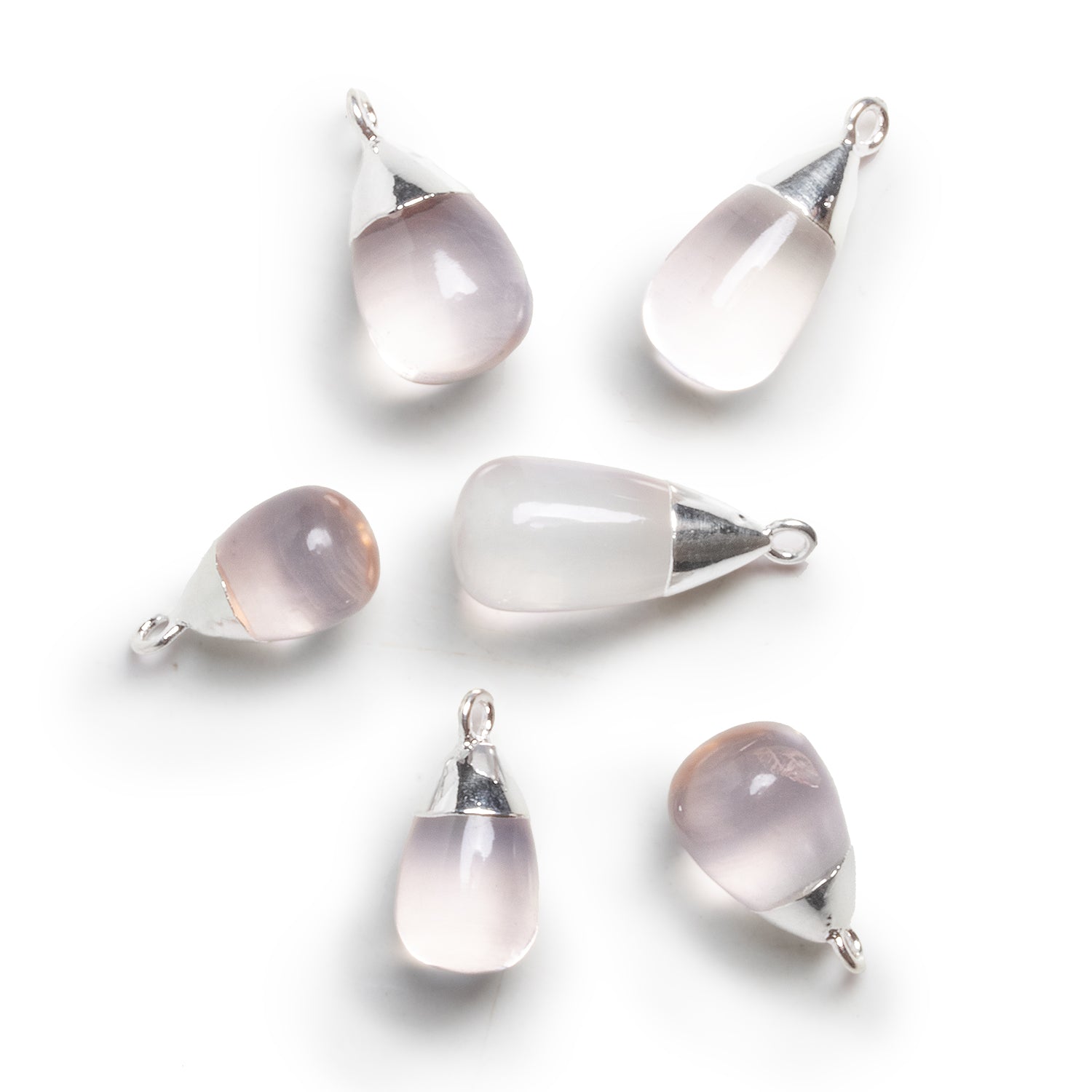 Beads measure about 18x10mm. These beauties show off a light pink hue on crystal clear bodies that emanate quality and sophistication. Finished off in our silver leaf, these beautiful pieces are sure to catch the eye as the focal bead of necklaces, as earrings, and more!