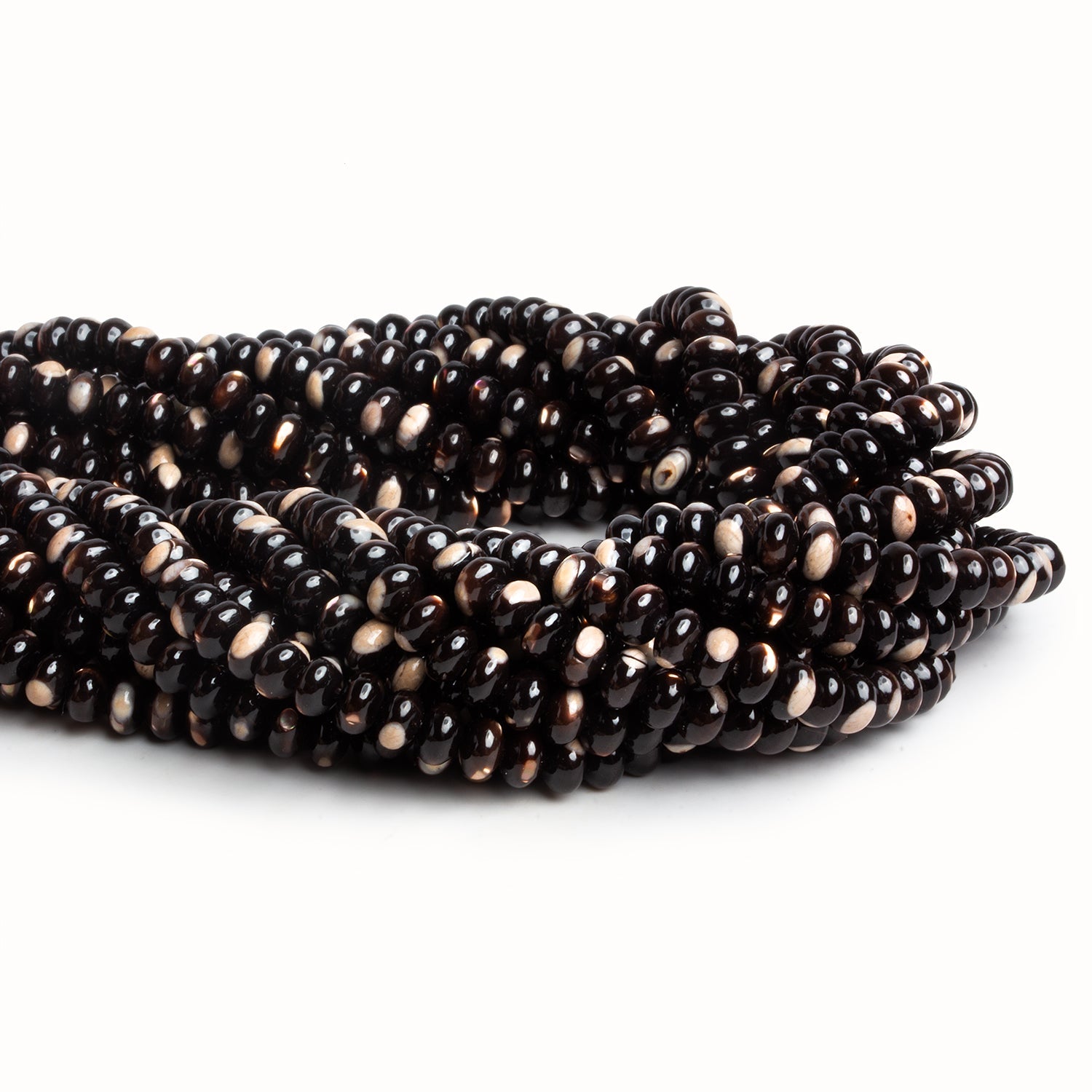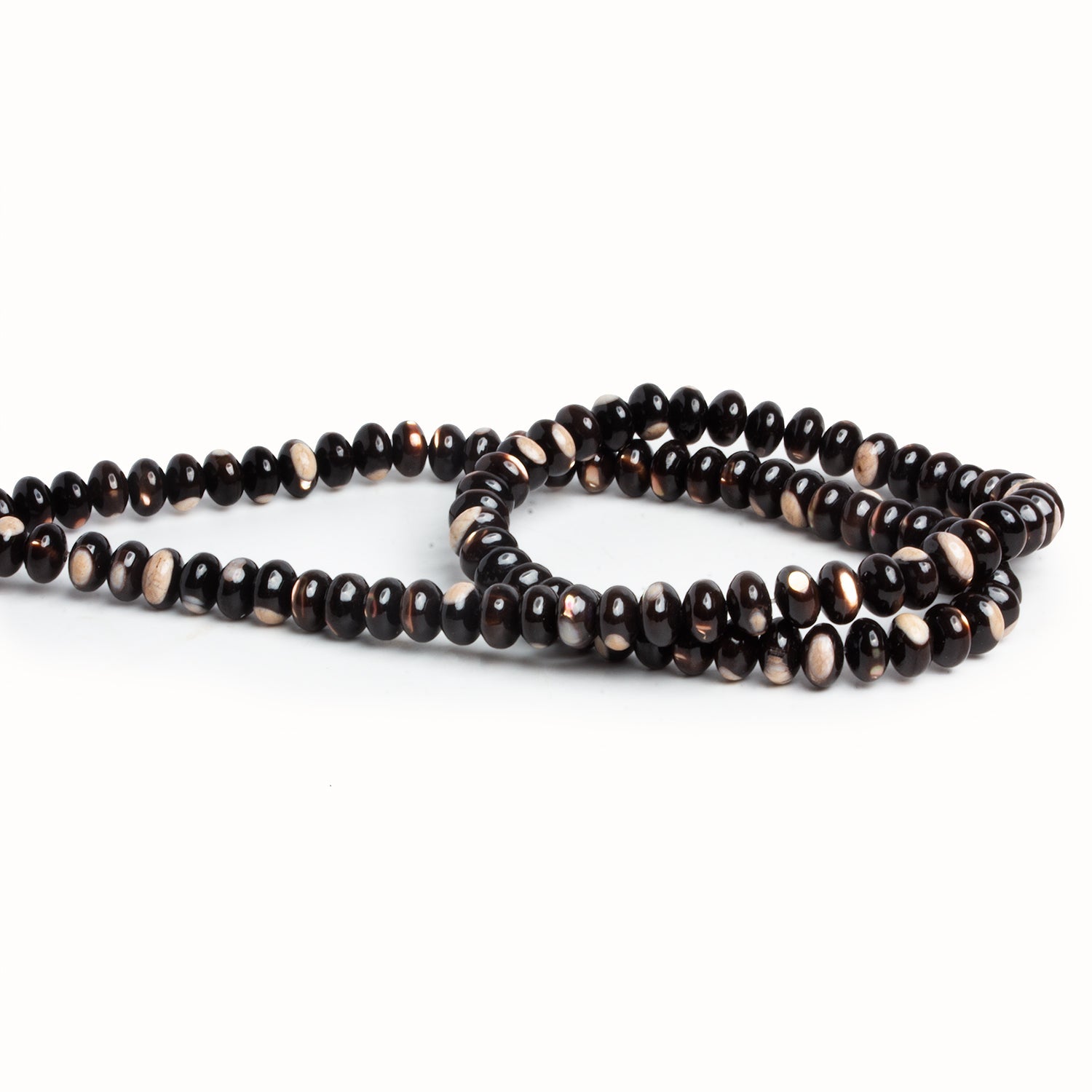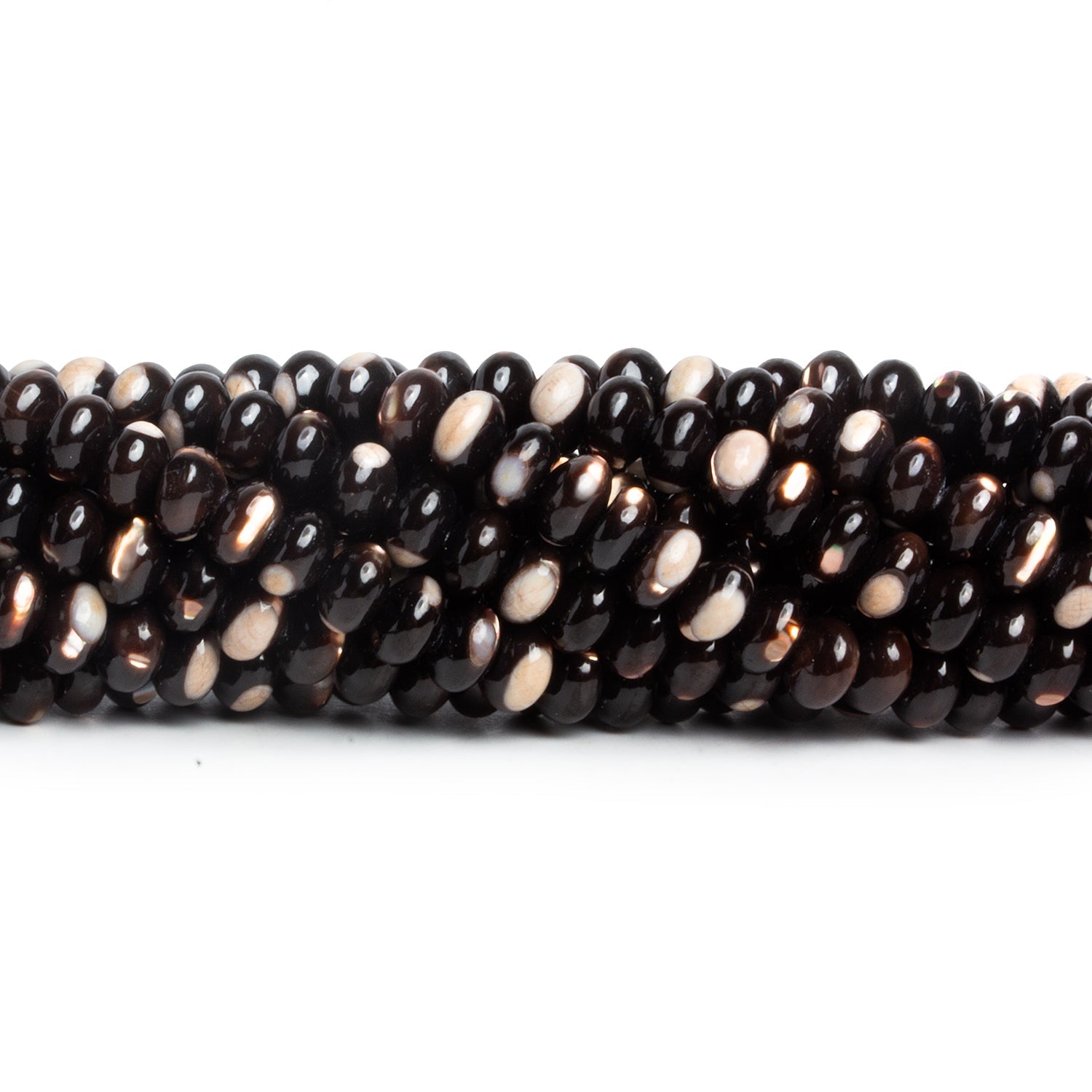 These 6mm Brown Shell Plain Rondelles display a rich, espresso-toned palette with flashes of warm caramel, ivory, and soft bronze that shimmer beautifully in the light. Each bead shows the natural organic patterning of shell, giving the strand a lively mix of tones and subtle iridescence that feels both earthy and elegant. Their small, uniform rondelle shape makes them perfect spacers or texture accents in designs that need depth without overwhelming the composition.