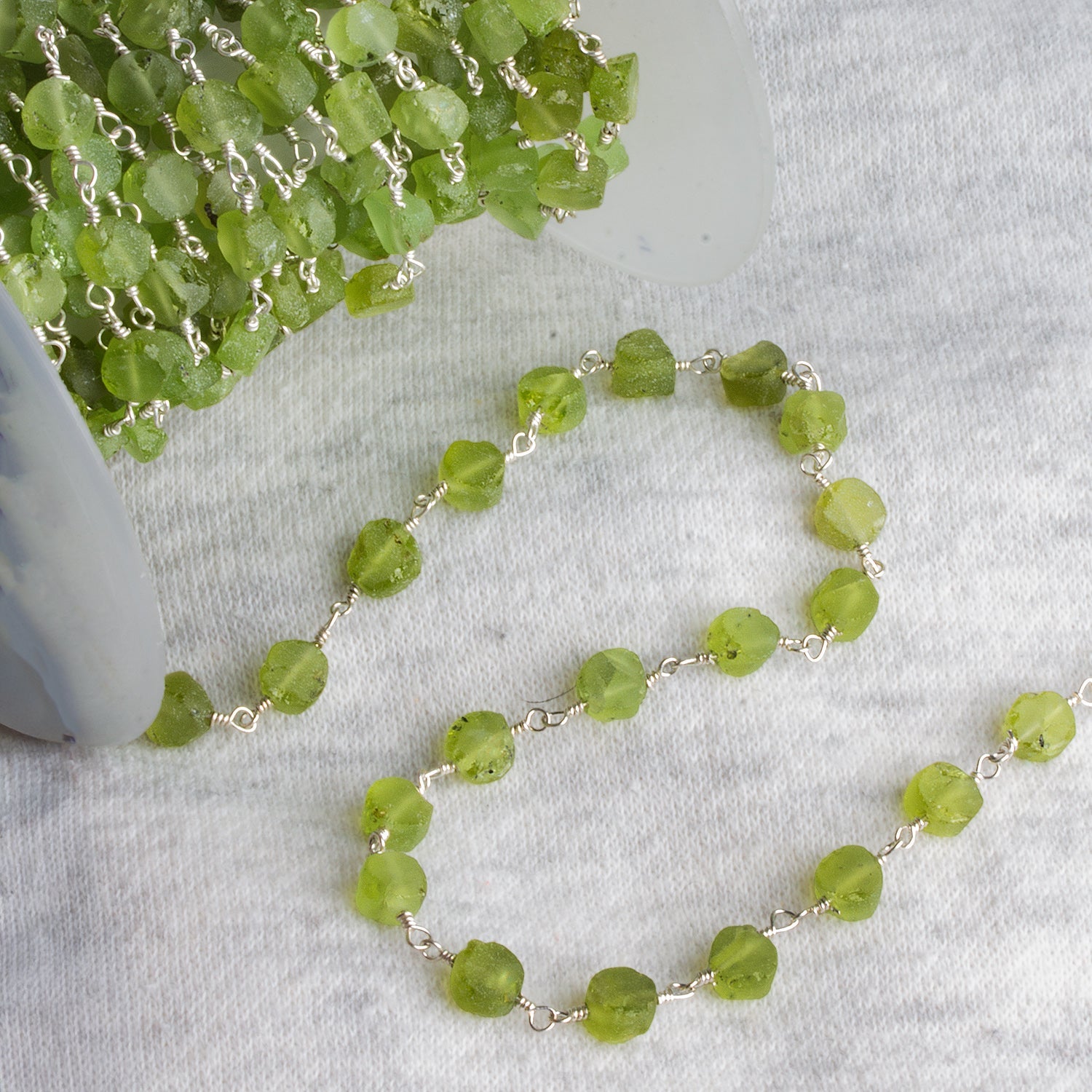 Sold by the foot with approximately 28 beads per foot, this peridot chain is ideal for custom necklaces, bracelets, station jewelry, rosaries, and mixed-media gemstone designs. The consistent coin shape adds rhythm and structure, while the soft matte surface pairs especially well with bright silver, oxidized metals, pearls, and other natural gemstones. Whether used as a primary design element or as a supporting accent, this peridot coin chain brings a calm, botanical elegance and a distinctly handcrafted feel to finished jewelry.