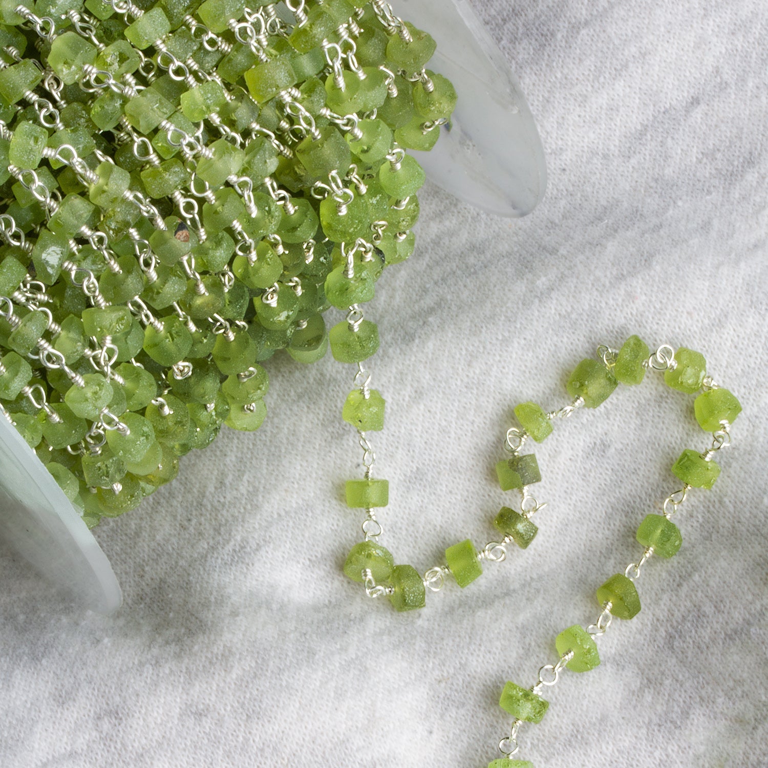Sold by the foot with approximately 35 beads per foot, this peridot chain is ideal for custom necklaces, bracelets, station jewelry, rosaries, and mixed-media gemstone designs. The consistent rondelle shape adds rhythm and structure, while the soft matte surface pairs especially well with bright silver, oxidized metals, pearls, and other natural gemstones. Whether used as a primary design element or as a supporting accent, this peridot coin chain brings a calm, botanical elegance and a distinctly handcrafted feel to finished jewelry.