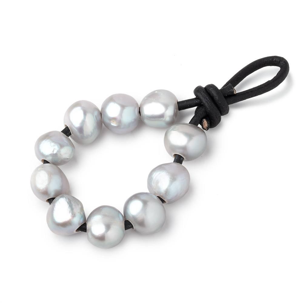 Teal Silver Side Drilled Large Hole Baroque Freshwater Pearls measure approximately 9x11mm to 10x12mm in size, the pearls have a high luster, pearls have great nacre quality showing some surface irregularities common to freshwater pearls, these freshwater pearls are well matched for color and quality on the strand, the pearls are side drilled with a larger hole size of 2.5mm diameter, these large hole pearls have a deeply saturated color treated body showing an iridescent overtone, and these Large Hole Freshwater pearls are an excellent value for an above average size of baroque freshwater pearl. Measurement: 9mm-10mm width x 11mm-12mm diameter