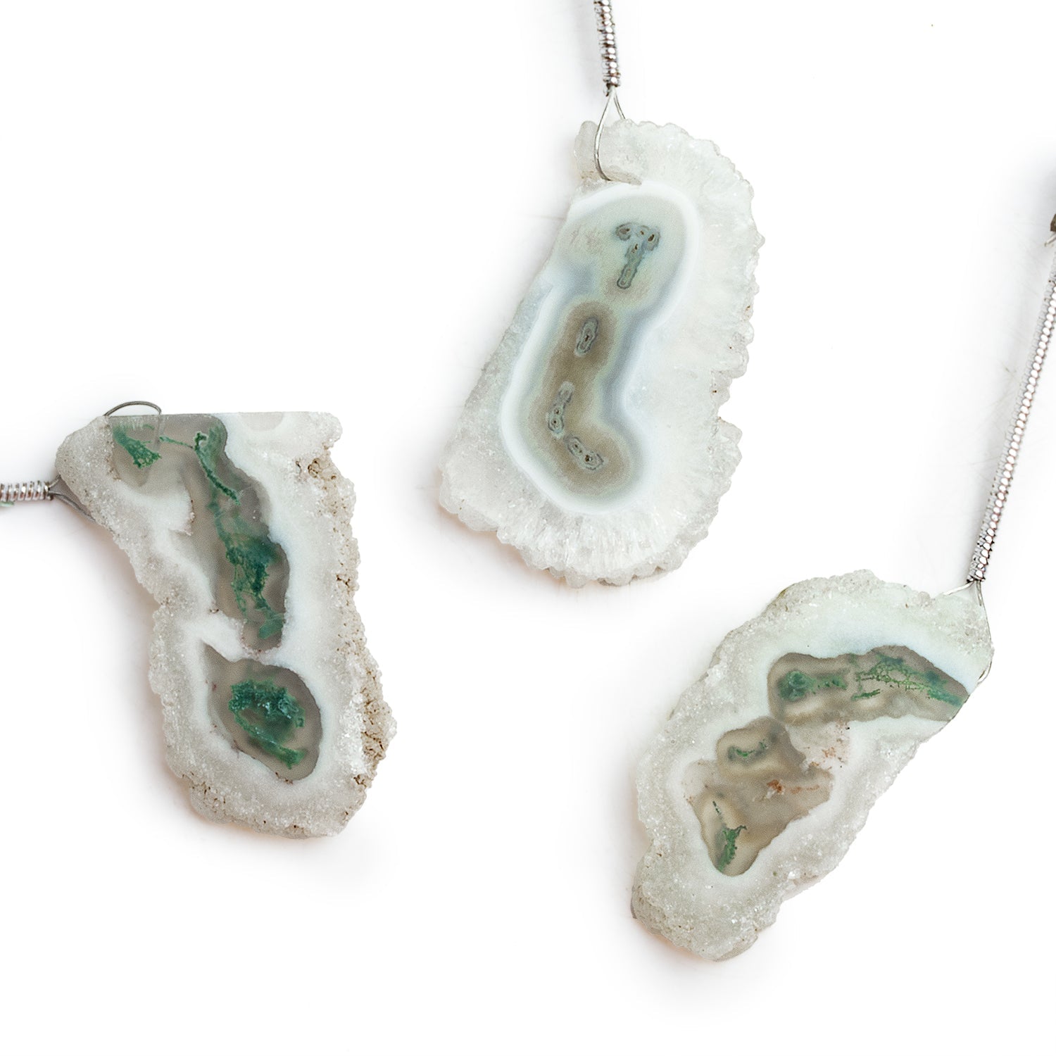 Explore the stunning mossy textures of our solar quartz natural slice focal beads. Each bead features a unique green pattern perfectly framed in the clear centers of these gorgeous thin pieces that exude all the elegant qualities of high-quality solar quartz. Bring a design together with these top-drilled offerings, ideal for hanging in ambitious necklace designs or bold earrings.
