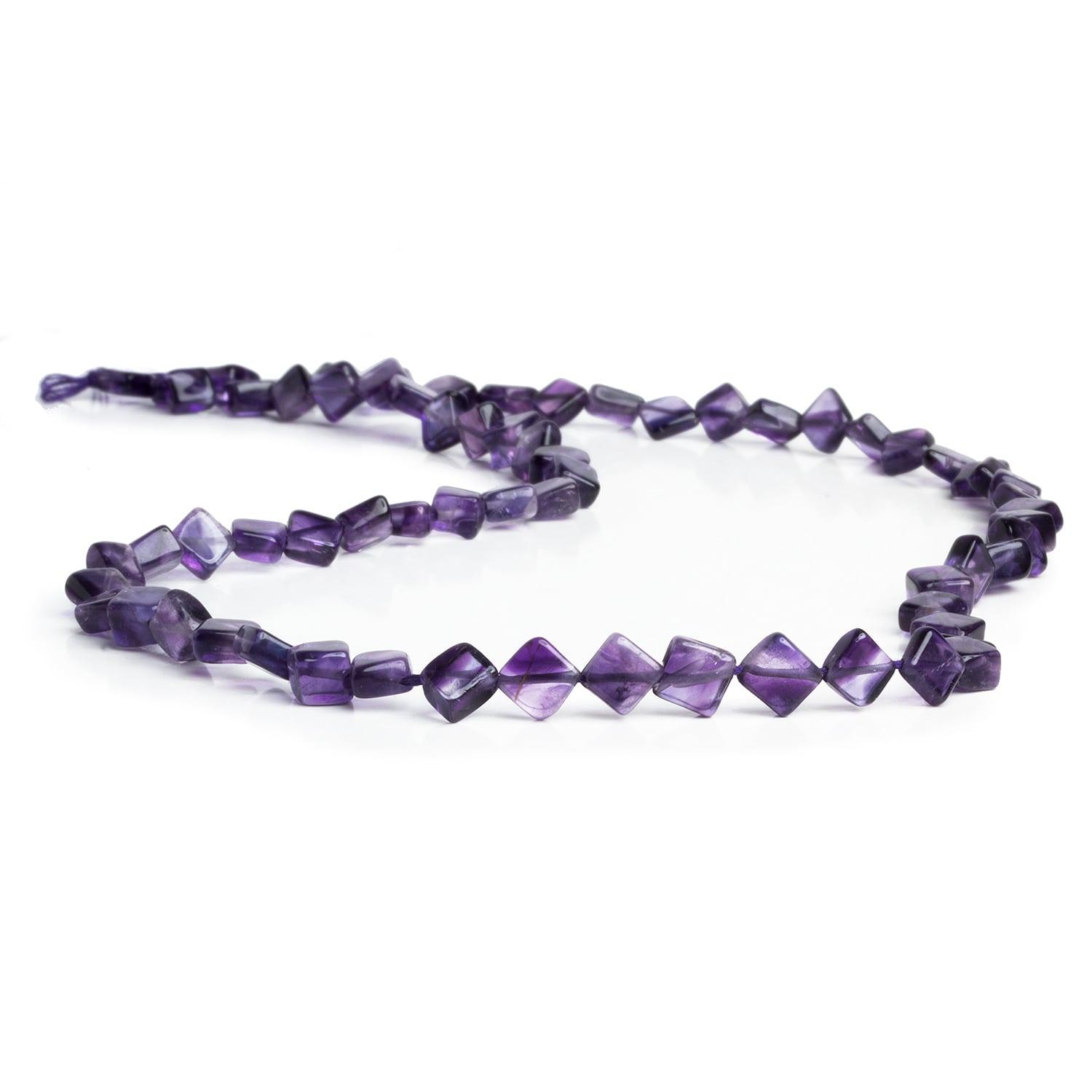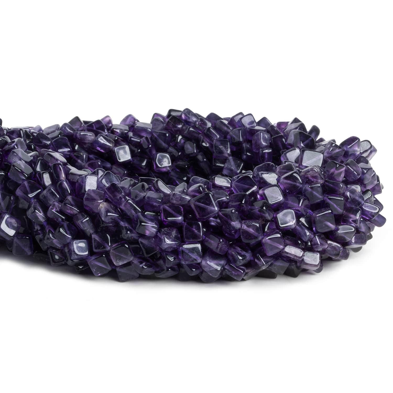 Beads average about 4.5mm. These squares are drilled corner-to-corner and feature translucent bodies with a vibrant Amethyst purple coloration. Expect some variation in size and shape.