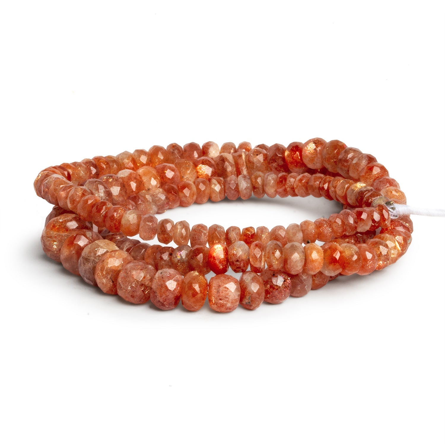 These Sunstone faceted rondelles display a rich spectrum of warm peach, copper, and ember-orange tones, accented by natural aventurescence that flashes with fine coppery sparkle as the beads catch the light. The faceting adds extra brilliance while still preserving the organic, earthy character Sunstone is known for. Sizes graduate naturally from approximately 4–8mm, creating a soft rhythm along the strand that works beautifully in both simple and layered designs.