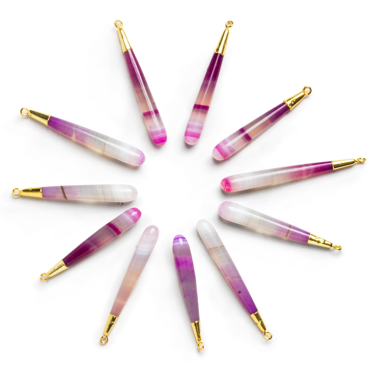 This striking teardrop pendant features natural banded Berry Chalcedony, showcasing soft gradients of blush pink, lavender, and milky white with subtle linear banding unique to each stone. The elongated 50x7mm teardrop shape gives these pendants an elegant, fluid profile, while the natural translucency allows light to move through the stone, enhancing its layered color zoning and depth.