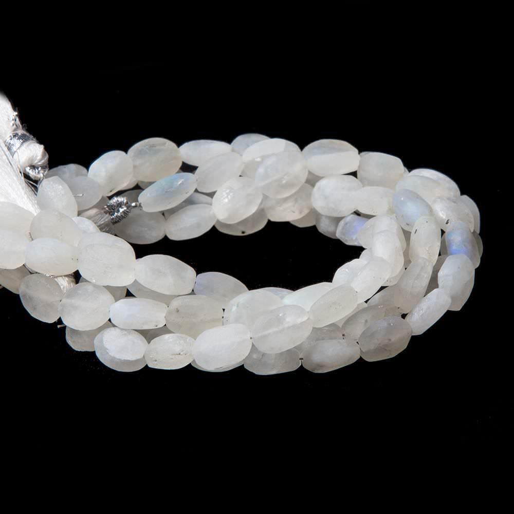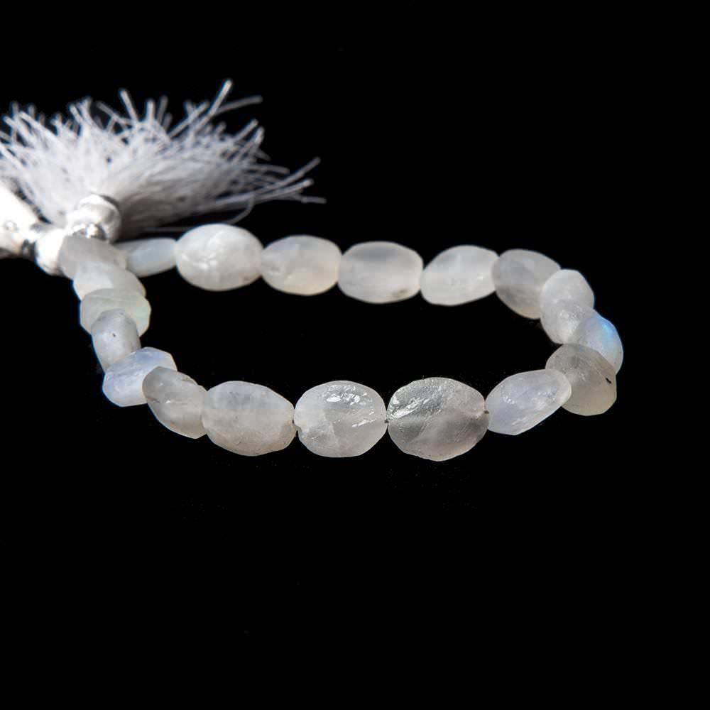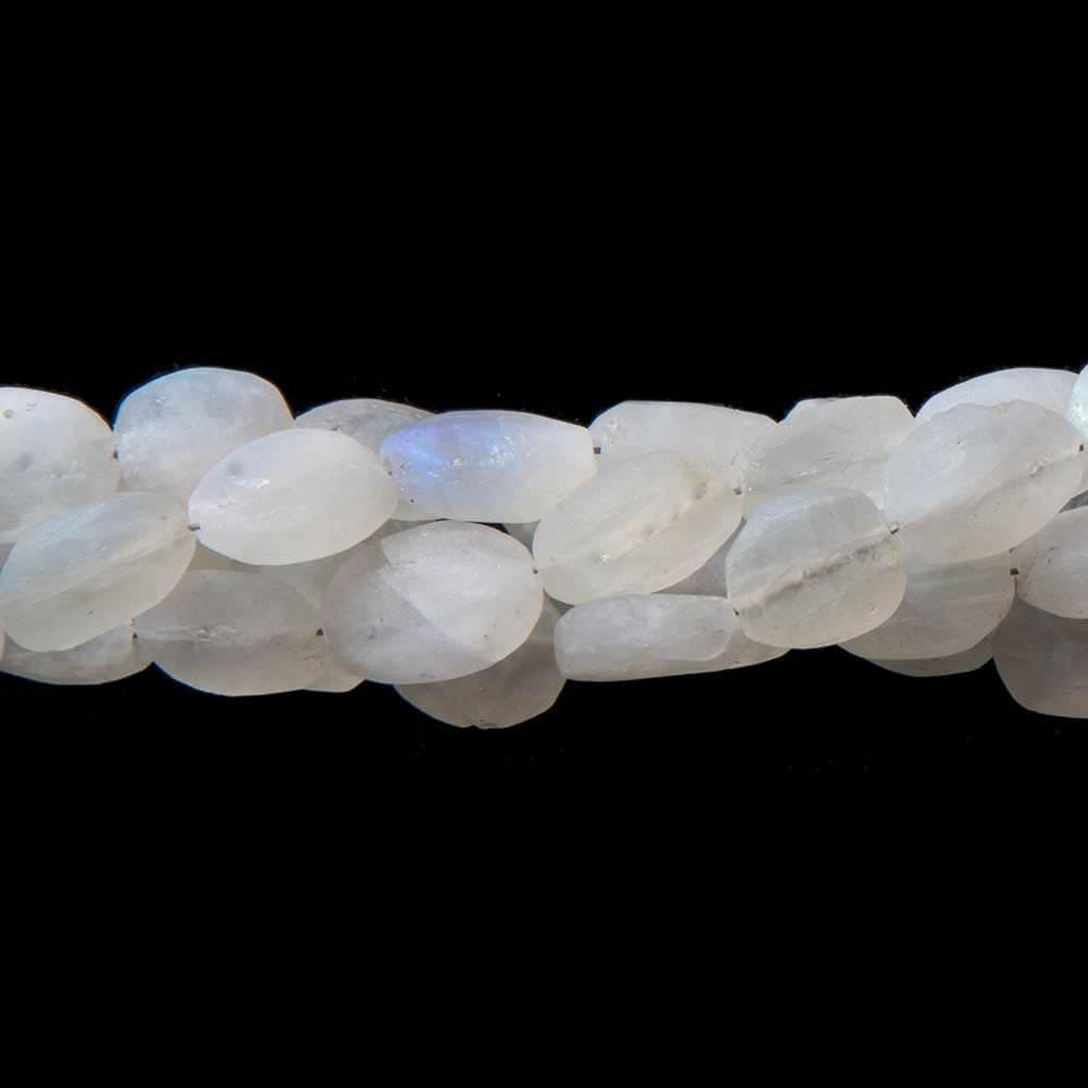 8.5x7mm up to 9.5x8mm Matte Rainbow Moonstone unfaceted oval beads are fairly symmetrical shapes with a frosted appearance exhibiting a translucent quality with consistent colorless hues with scattered flash throughout the very well made Frosted strand.