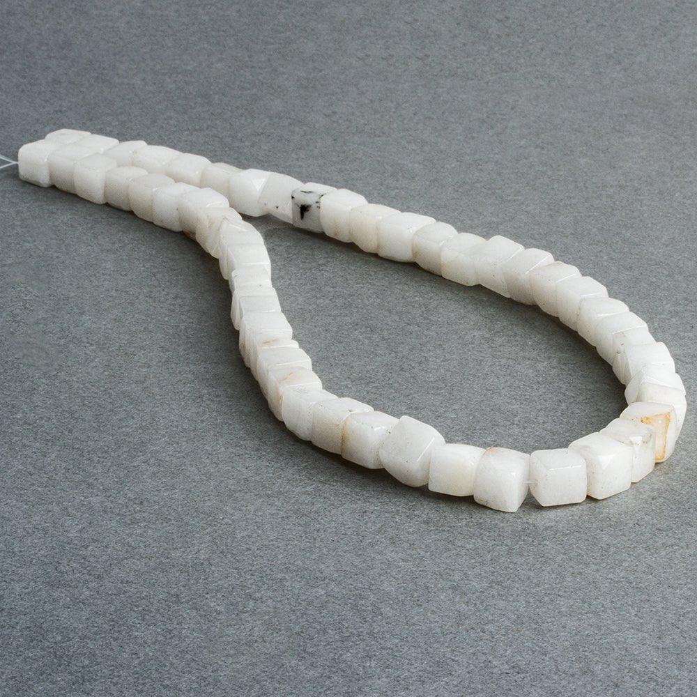 Beads measure about 7mm to 8mm in diameter. These cubes have opaque white, almost marble-like bodies with some fracture and warm coloration visible. Beads vary in size and shape somewhat.