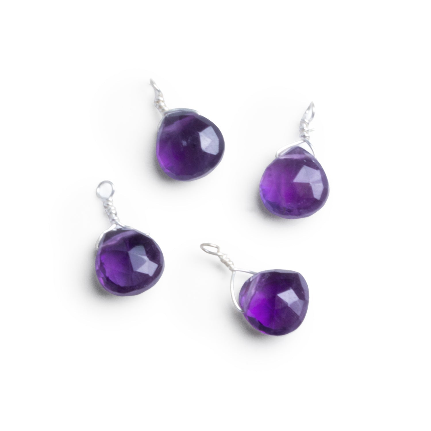 These 7mm Amethyst wire-wrapped heart pendants glow with deep royal purple tones and crisp faceting, each one carefully finished in bright sterling wire. Sold as matched sets of 4, they’re perfect for creating coordinating earrings, charm clusters, or cohesive multi-strand designs. Sweet, versatile, and polished enough to stand on their own, they add an instant jewel-like pop to any piece.