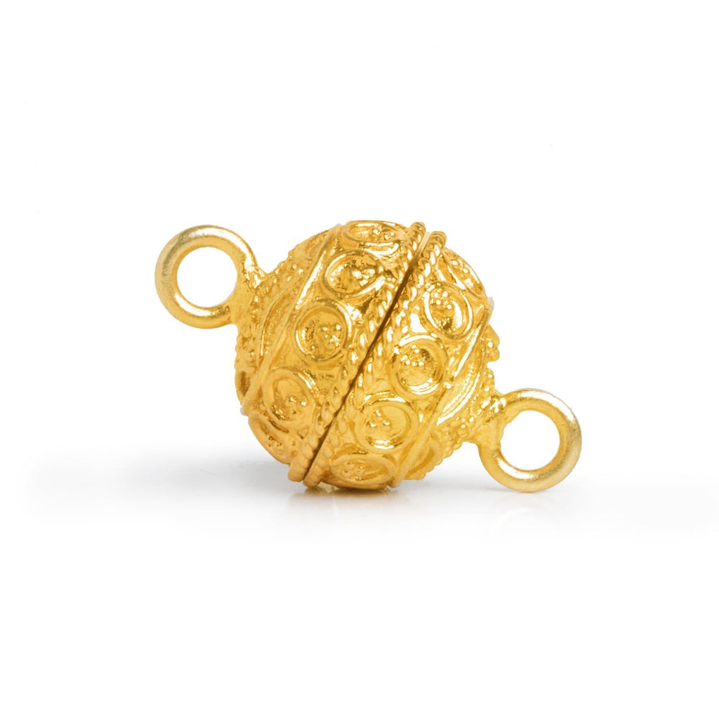 Clasps measure about 15mm in diameter and are plated in 22kt Gold. These strong magnetic clasps feature a highly decorated miligrain circle design perfect for bringing together your next piece of Jewelry.