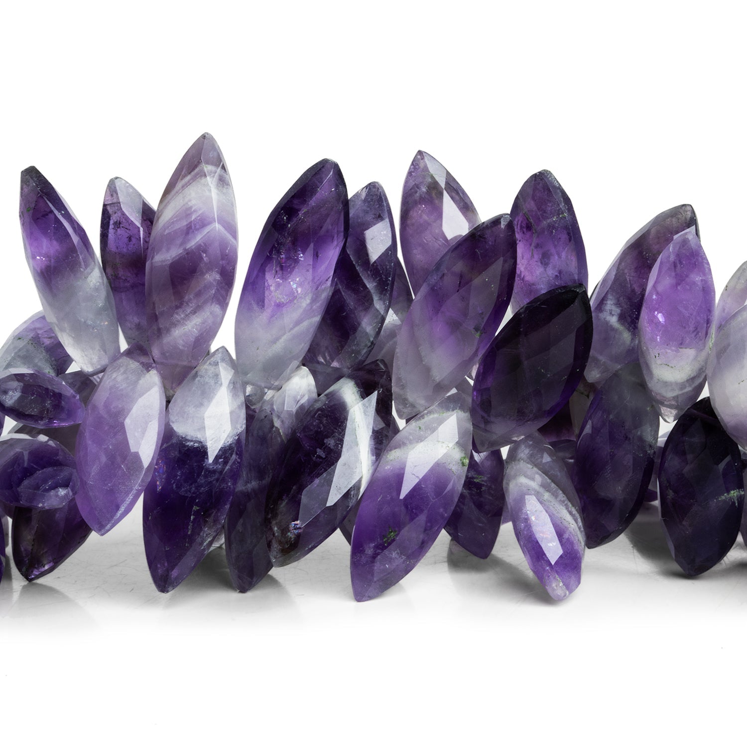 Beads measure about 19x8mm with a few mm of variation possible. Feast your eyes on the dazzling chevron patterns of Cape Amethyst, the premium variety of natural Amethyst that features this striking look. Each marquise is sizable, top-drilled and meticulously faceted for a versatility that rivals most beading options. Our Cape Amethyst Marquise pieces are ideal for a wide range of Jewelry Designs from necklaces to earrings and much more.