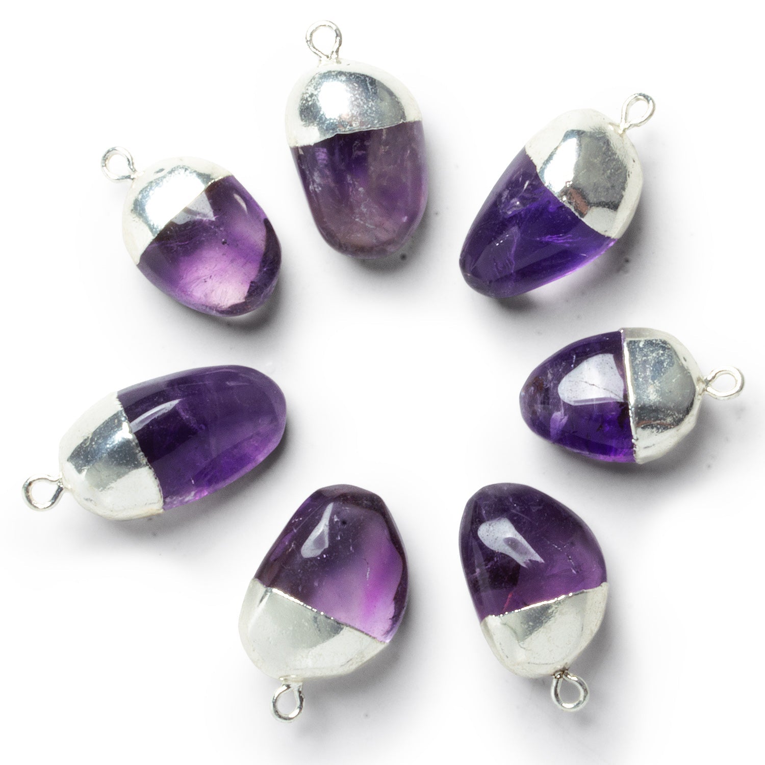 These Silver Leafed Amethyst Nugget Pendants offer a timeless balance of natural gemstone beauty and refined metallic accents. Each pendant showcases the rich purple tones of polished amethyst, cut into smooth organic nugget forms that highlight the stone’s natural clarity and internal textures. Finished with radiant silver leaf detailing along the cap, these pendants bring an elevated yet versatile charm that’s ideal for both casual and formal designs.