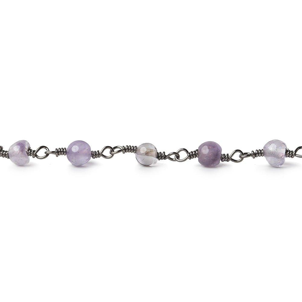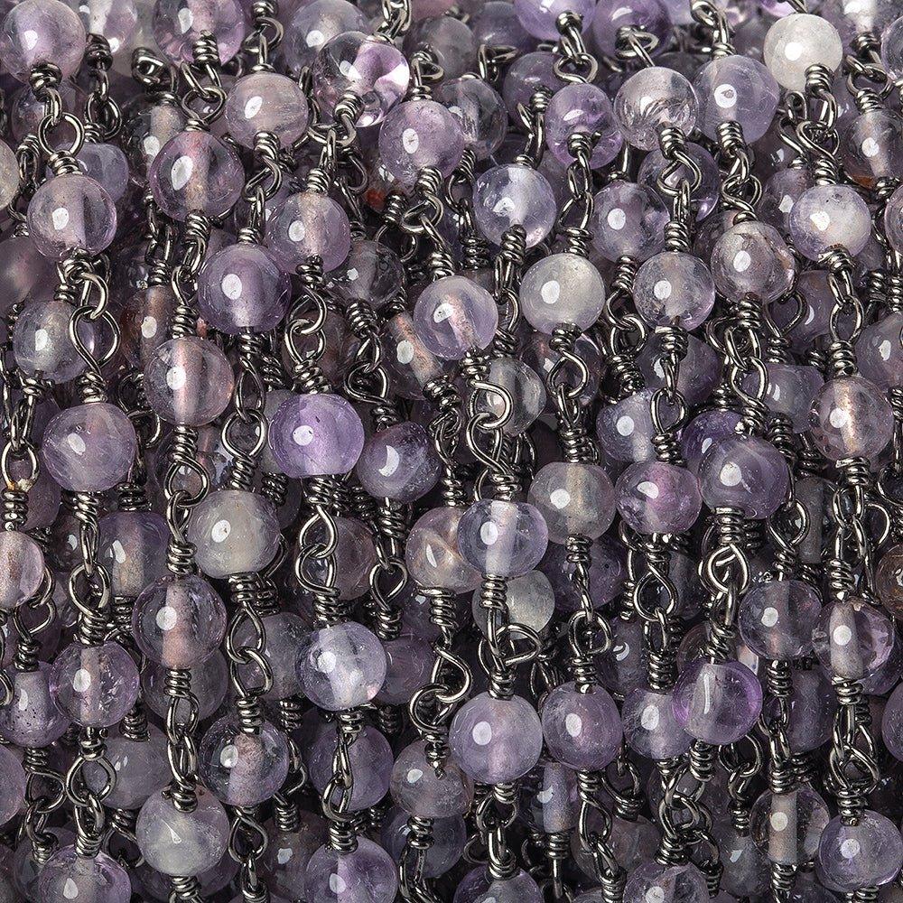 4mm diameter average for these Amethyst plain round beaded hand wire-wrapped Black Gold plated Chain by the foot having approximately 31 beads per 12 inch increment. Chain will be cut as continuous foot when available & length will be determined by quantity selected. (ie. 5 quantity = 5 feet)