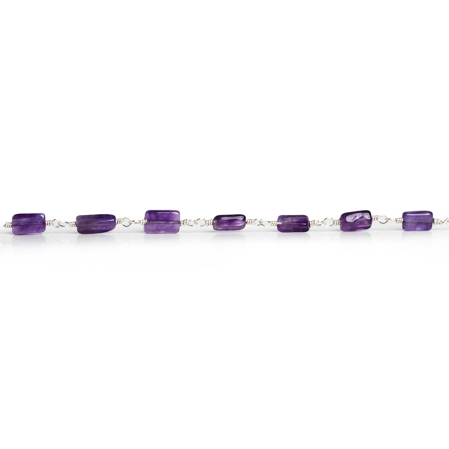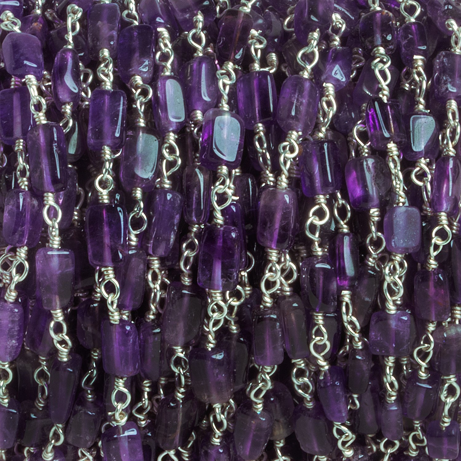 Beads average about 6x4mm with 1mm or so of variation possible. This rough-cut Amethyst pieces show off a rich and relatively dark color on cloudy to translucent bodies. These purple pieces look amazing paired with our signature handwrapped silver plated chain, perfect for a wide array of Jewelry Designs from necklaces to earrings and more.