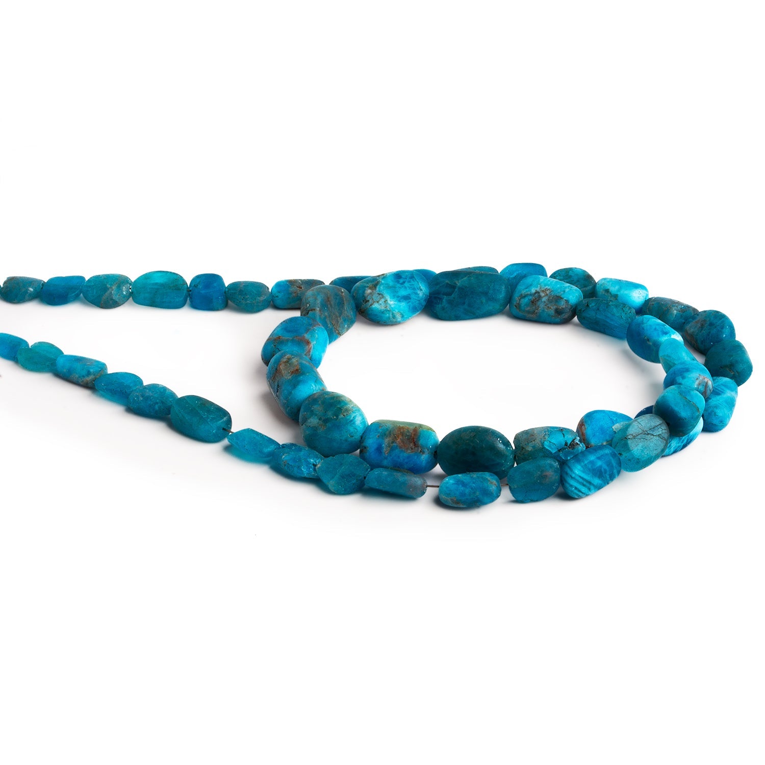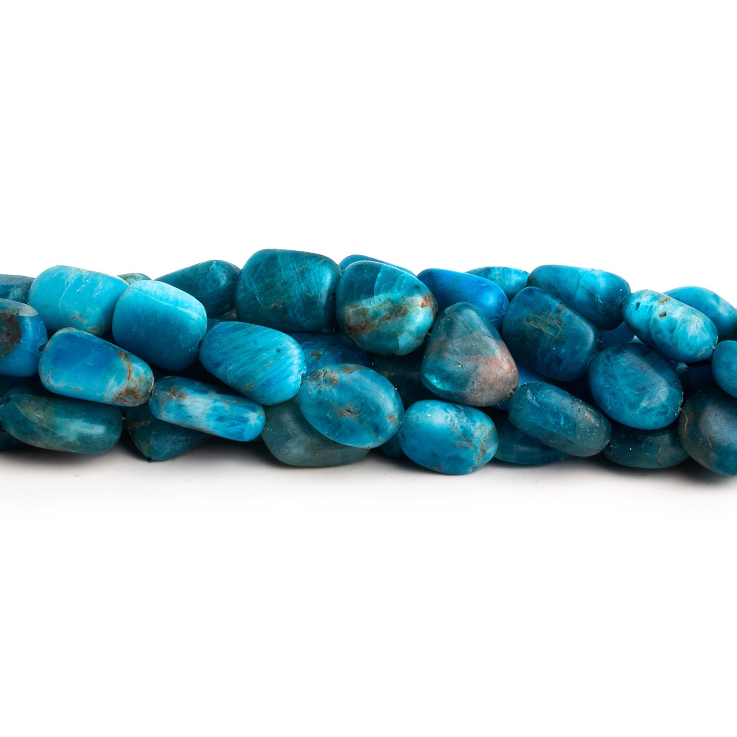 Vivid and full of natural character, these Matte Apatite Plain Nugget Beads offer an oceanic palette of electric blues, teal greens, and subtle earthy undertones. Ranging from 7x5mm to 14x11mm, each bead is tumbled into an organic nugget shape and finished with a velvety matte surface that enhances the stone’s raw, earthy appeal. The natural variation in size, shape, and tone makes each strand truly one-of-a-kind—perfect for designs that embrace texture and individuality. Ideal for bohemian-inspired pieces or bold, freeform designs, these high-quality apatite nuggets bring a splash of color and a touch of the untamed to any jewelry project. Their matte finish softens the brilliance of apatite, lending a grounded, rustic charm that pairs beautifully with wood, leather, or mixed gemstones. Let these beads infuse your work with the natural energy and vibrant beauty of the sea.