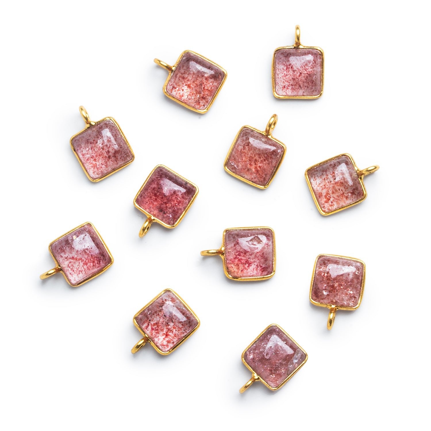 These 8mm Vermeil Bezeled Strawberry Quartz Square Pendants showcase soft blush-to-rose tones filled with shimmering, naturally occurring inclusions that give strawberry quartz its signature depth and texture. Each square cabochon is polished smooth, allowing the internal sparkle to catch the light, and framed in a warm gold vermeil bezel that enhances the stone’s romantic color palette.