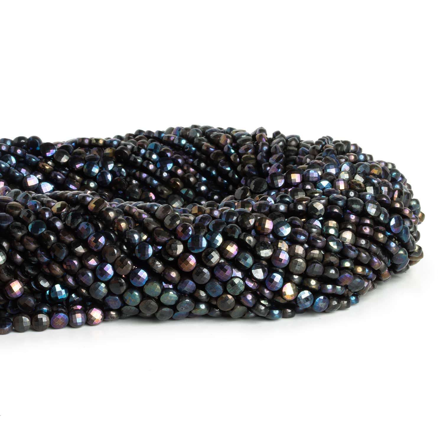 Beads measure about 4mm in diameter. These checkerboard calibrated coins show off the unmatched brilliance of our signature Mystic finish on dark black spinel bodies. Expect a blue peacock color palette with blues, purples and yellowish-green most prominent.
