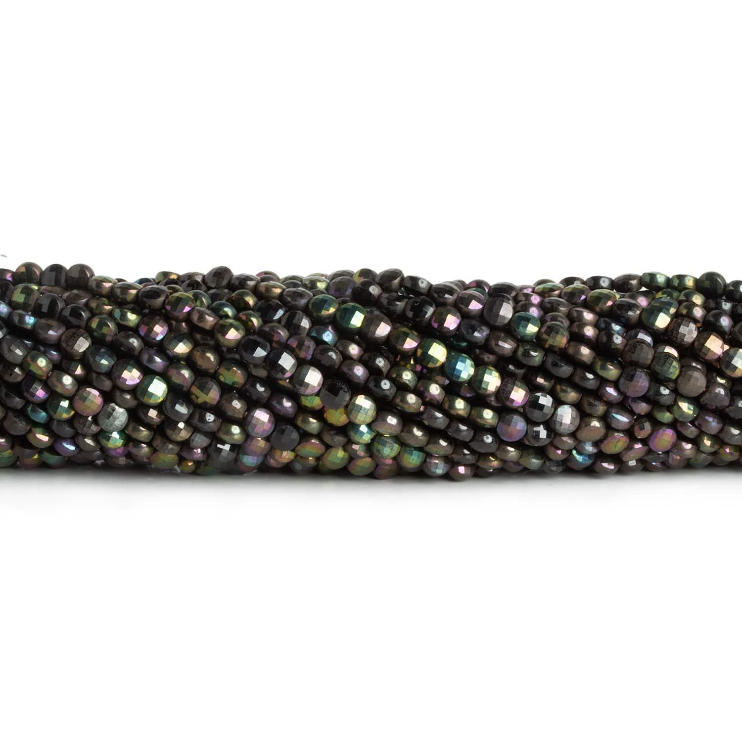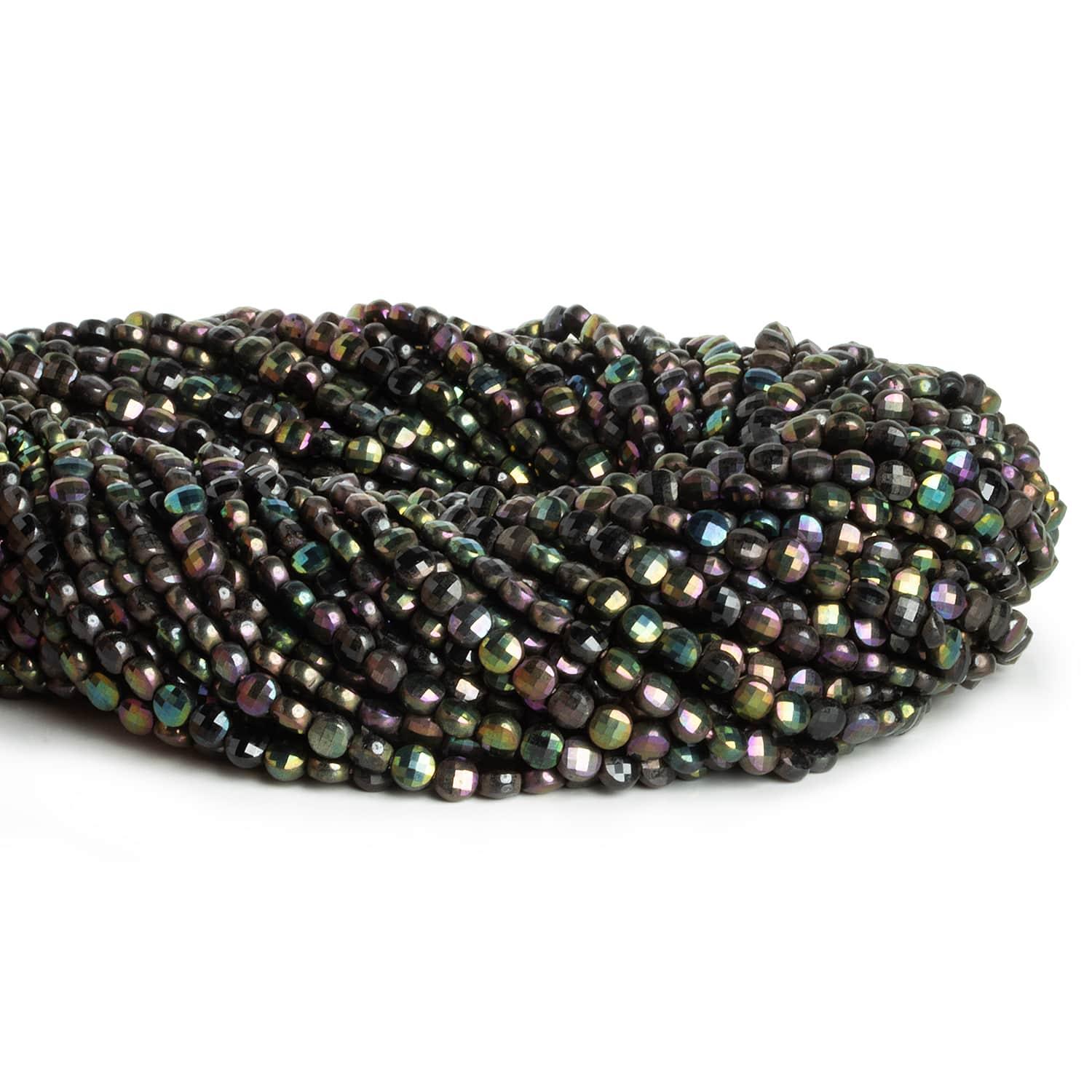 Beads measure about 4mm in diameter. These checkerboard calibrated coins show off the unmatched brilliance of our signature Mystic finish on dark black spinel bodies. Expect a peacock color palette with greens, purples and yellows most prominent.