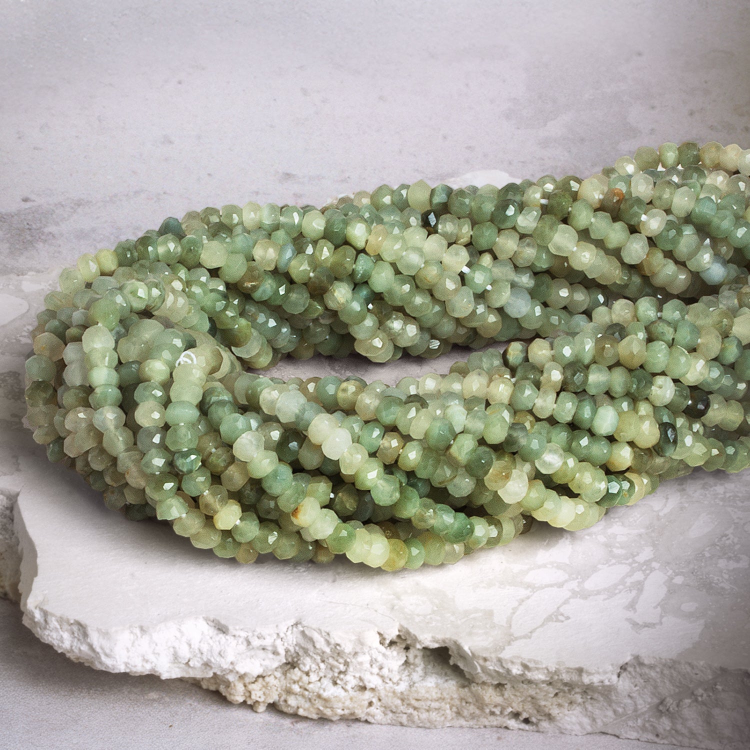 Cat's Eye Green Quartz faceted rondelle have a vitreous luster with a cat's eye phenomenon caused by tiny needles aligning within the structure of the stones. The beads have been faceted as symmetrical rounds with each bead exhibiting consistent color and appearance. These Cat's Eye Quartz beads have olive green Chlorite inclusions within the Crystal Quartz bodies causing the green hued stone. This will be a unique addition to your gemstone collection.