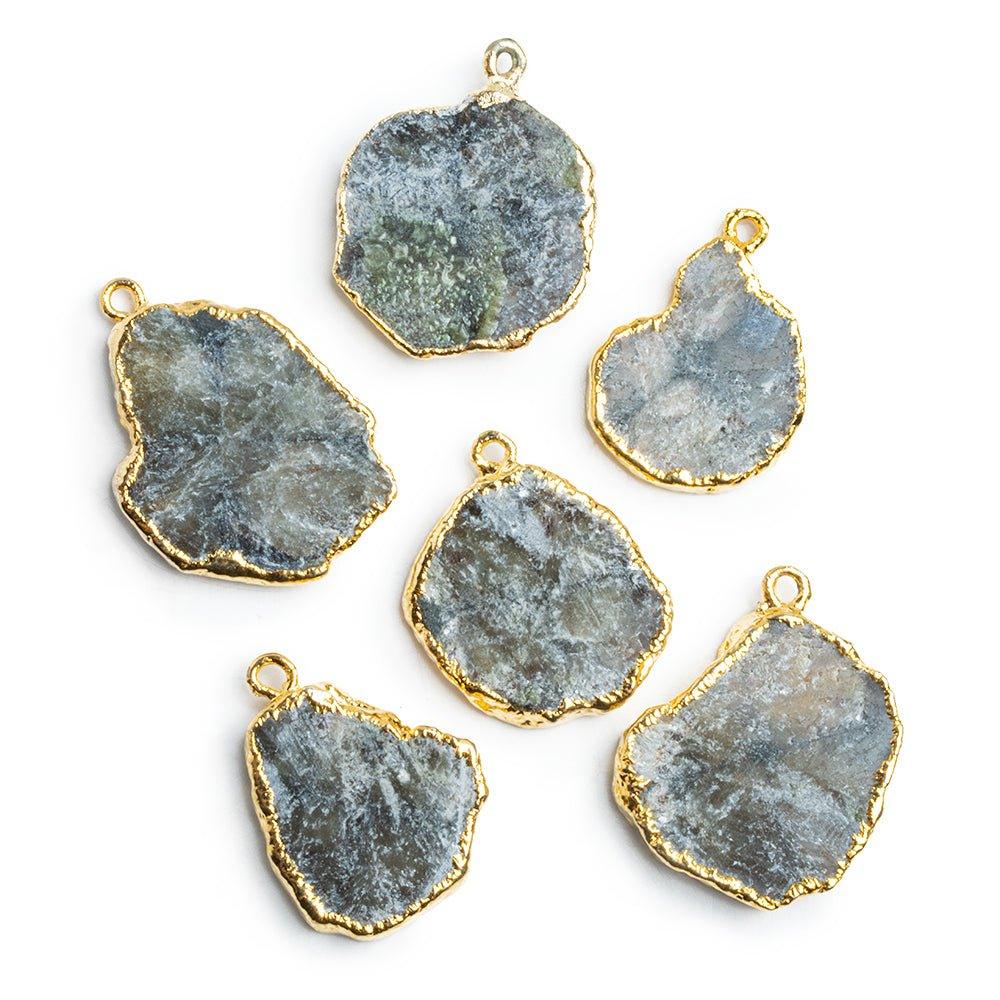 Beads average 22x20mm. These beautiful pendant beads show off the swirling textures of Charoite in muted tones that look amazing paired here with our signature gold leaf. These pieces are destined to shine as focal beads in a wide range of designs, from necklaces to earrings and more.