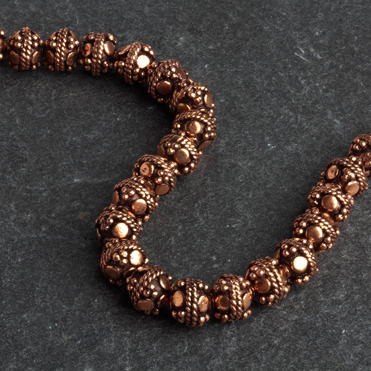 Add bold, ornamental character to your designs with these 8mm Copper Decorated Round Beads. Each bead is richly detailed with raised dot and rope-like textures, creating a unique patterned surface that reflects traditional metalworking styles. Their warm copper tone enhances the dimensional detailing, offering a rustic yet elegant appearance that stands out beautifully in jewelry and craft projects alike.