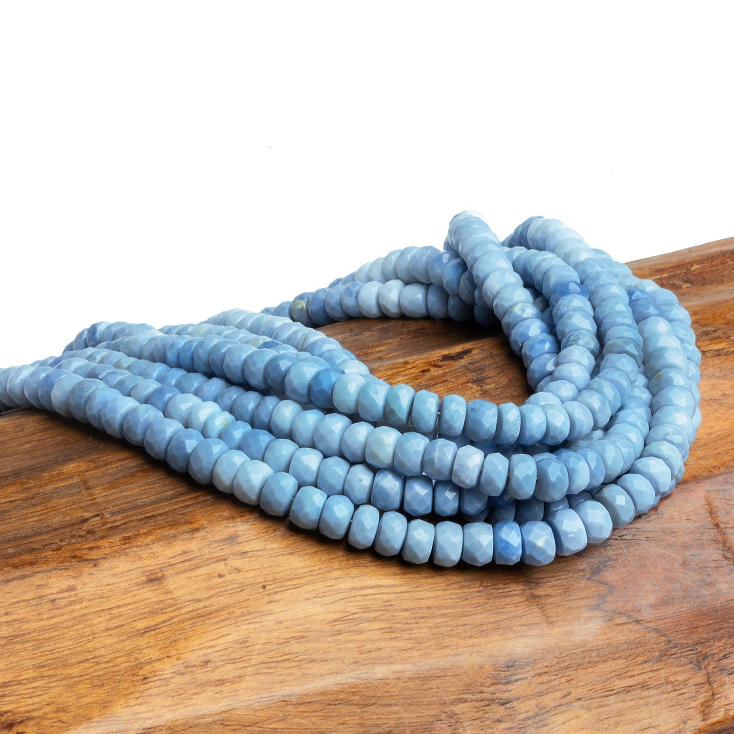 These Denim Opal Faceted Rondelle Beads showcase a soothing palette of soft denim-blue tones, delicately faceted to enhance their natural luster. Each 6–7mm bead reflects a subtle interplay of light across its surface, with shades ranging from misty sky blue to deeper stormy hues, creating a calming yet vibrant look. Their faceted cuts add a refined sparkle, making them perfect for designs that balance elegance with a natural, earthy charm.