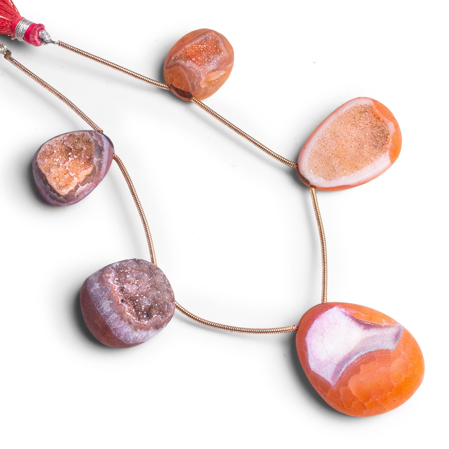 These Multicolor Drusy Beads feature a captivating blend of vivid hues, ranging from fiery oranges and soft lavenders to earthy neutrals, each accented by natural crystalline drusy textures. Their freeform pear and oval shapes highlight the raw beauty of agate, with sparkling drusy surfaces creating a striking contrast against the polished edges. Each bead is unique, showcasing layered color bands, glistening quartz-like interiors, and organic variations that emphasize their natural charm.