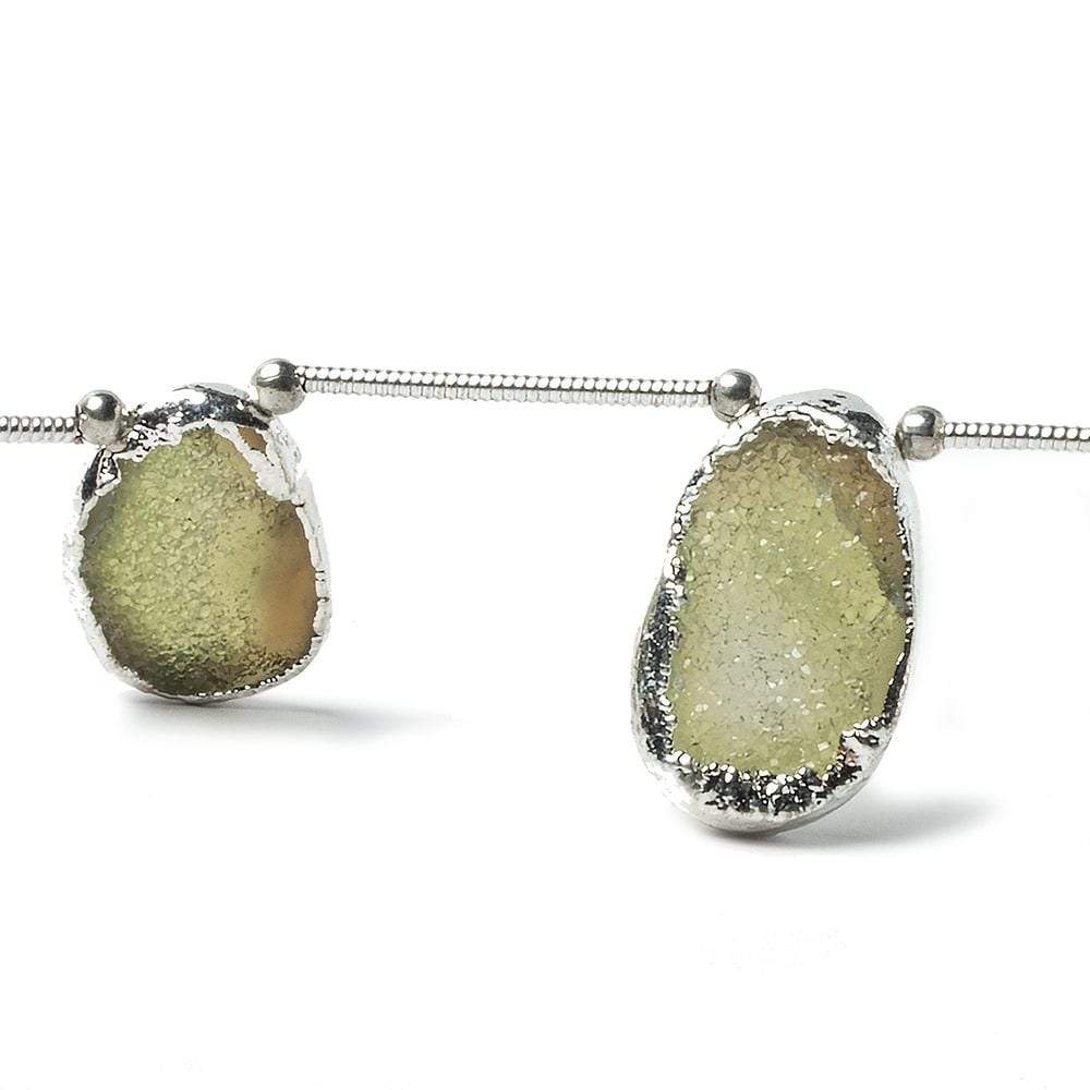 15x11, 18x11, 18x16, 27x12, 16x11, 21x9, 14x12mm Silver Leafed Multi Cream Set of 7 Agate drusy focal bead shows brilliant crystal features on an asymmetrical free form shape. The Drusy back side has a vitreous luster and the front has sugar-like crystal formation with Silver leafedback and sides. The drill hole is on the top from side to side. The Druzy bead is slightly curved to show the natural shape of the parent stone. Each hand picked Drusy bead will be a wonderful addition for your collection of rich, color treated Drusy focals.