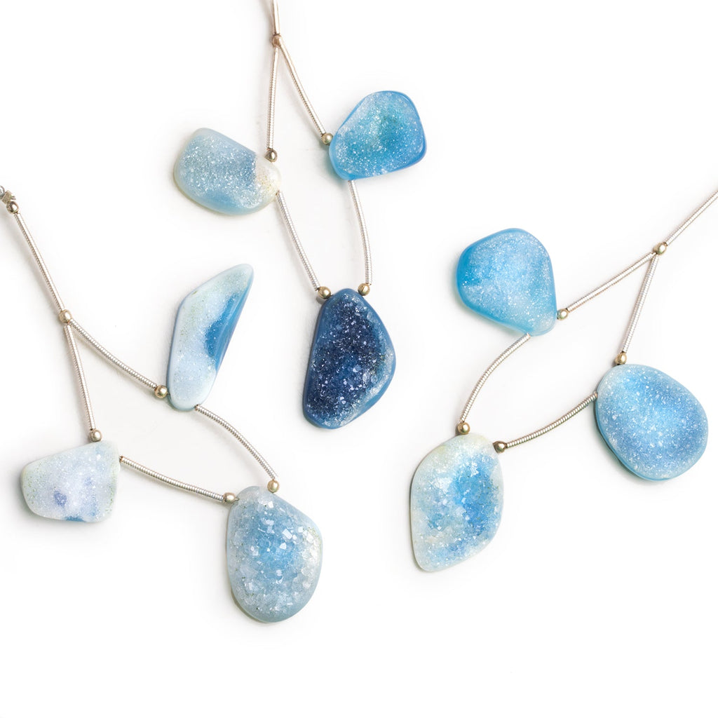 Beads range from about 14x10mm to 21x19mm. Experience the stunning sparkle of our gorgeous blue drusy focal beads, each showing off a naturalistic shape and crystalline texture that makes this gem sought after. Our focal beads are ideal for bringing together a statement necklace design, creating matching earrings and much more. Our Blue Drusy is color-enhanced.