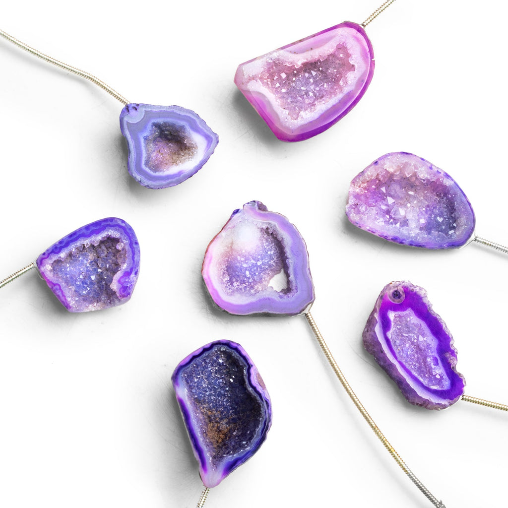 Beads range from about 15x14mm to 37x35mm. Experience the stunning sparkle of our gorgeous purple drusy focal beads, each showing off a naturalistic shape and crystalline texture that makes this gem sought after. Our focal beads are ideal for bringing together a statement necklace design, creating matching earrings and much more. Our Purple Drusy is color-enhanced.